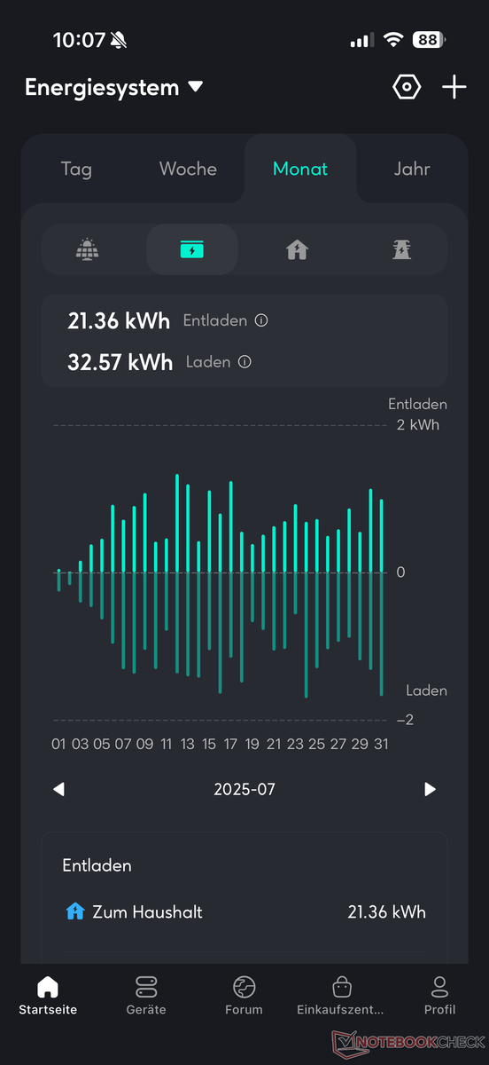 The efficiency when charging via the power grid, which is possible with up to 1,000 W, is significantly lower. According to measurements, only 80 percent of input energy was stored in the battery, while the rest was expended as conversion losses. The rest is conversion loss, which should definitely be taken into account when using dynamic electricity tariffs.