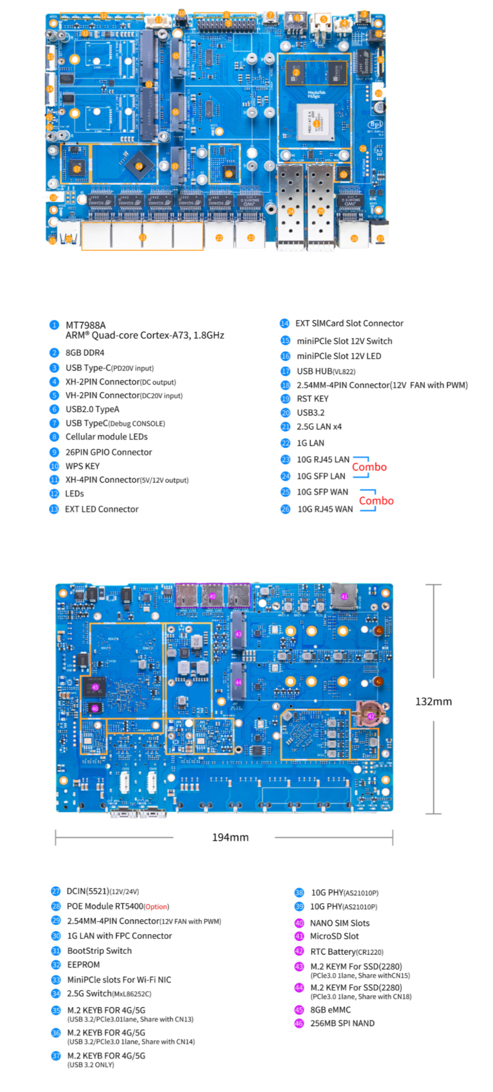 Moreover, Banana Pi equips its 4E and 8X variants with 4 GB DDR4 and 8 GB DDR4 RAM, respectively. Conversely, both BPI-R4 Pro variants feature a MediaTek MT7988A chipset with four ARM Cortex-A73 CPU cores clocked at 1.8 GHz, 8 GB of eMMC flash storage, a microSD card reader and multiple M.2 slots for B-Key and M-Key expansion.