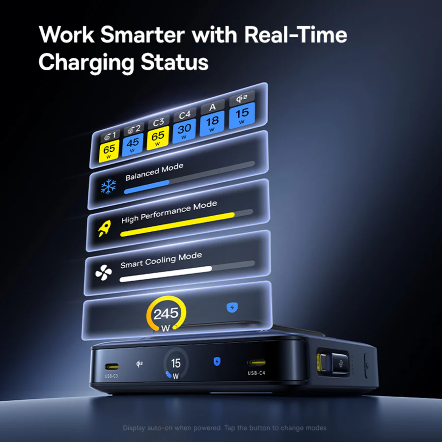 The Nomos NH21 has a built-in 3-inch LCD display, showing essential information such as real-time total power, modes, boot animation, wireless charging output, and more. Speaking of compatibility, the charger is compatible with a wide range of devices, including smartphones, tablets, laptops, drones, and cameras. Moreover, it supports PD 3.1, QC 4, PPS, and SCP fast charging protocols.