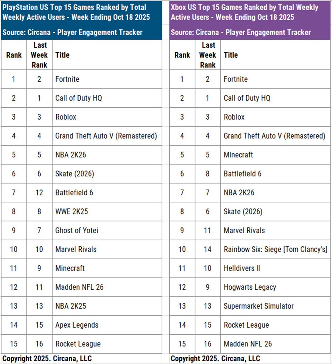 Mat Piscatella shared Circana data on Bluesky, showing player engagement on PlayStation and Xbox. The statistics cover the week ending October 18th, including the first days after the Battlefield 6 release date. Measuring total active users in the U.S., the Call of Duty HQ ranks second behind Fortnite. Meanwhile, Dice’s new shooter is in seventh place on PlayStation and sixth on Xbox consoles.