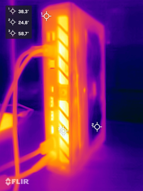 The case temperatures in the Asus ROG NUC 15 remain uncritical throughout. Some areas heat up more. However, extreme values do not occur. The Intel Core Ultra 9 275HX only briefly reaches 80 °C and thus remains pleasantly cool. The Nvidia GeForce RTX 5080 laptop GPU operates at an average of 77 °C with a normal power consumption of 120 watts.