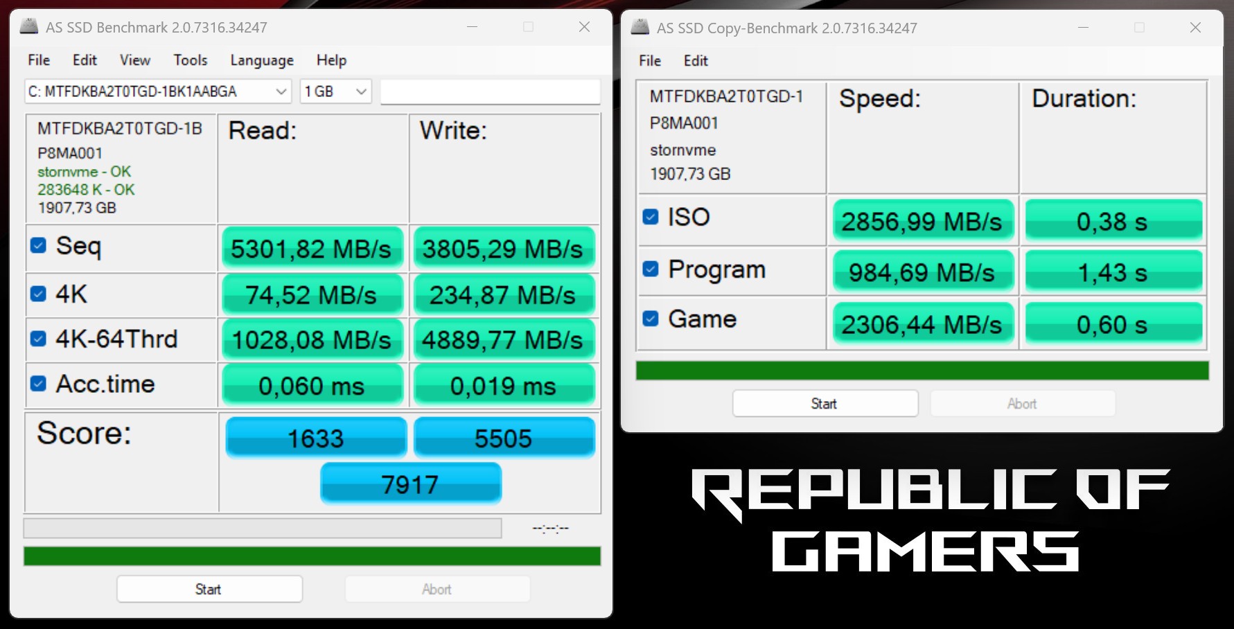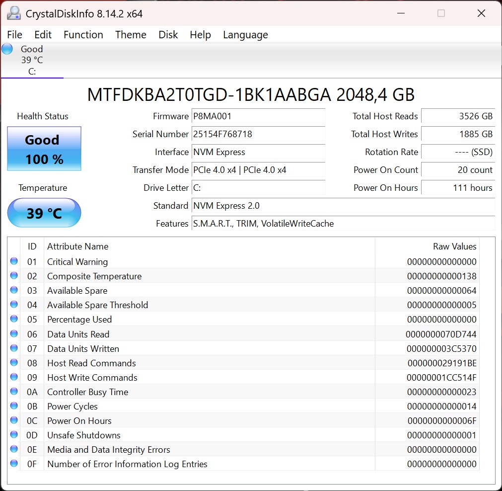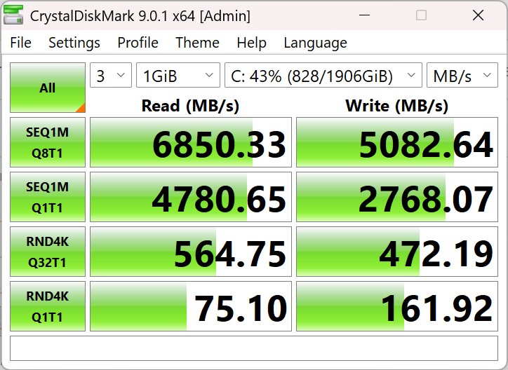 The Asus ROG NUC 15 is equipped with a 2 TB M.2 SSD from Micron, which operates at full PCIe 4.0x4 speed. The performance is sufficient to secure a good place in the midfield. In addition, the performance remains constant and without dips even under load. A total of two M.2 2280 SSDs can be installed in the device.