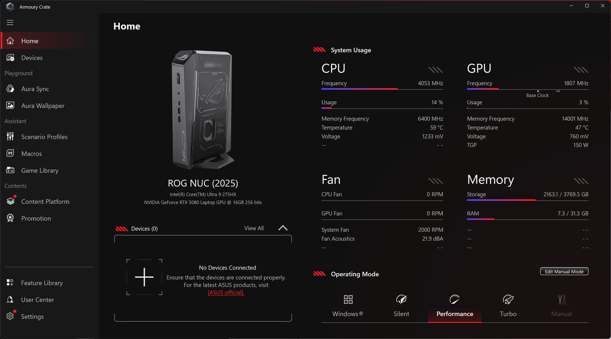 The top model of the Asus ROG NUC 15 combines the Intel Core Ultra 9 275HX with the Nvidia GeForce RTX 5080 laptop GPU to deliver powerful performance, even for QHD gaming.
