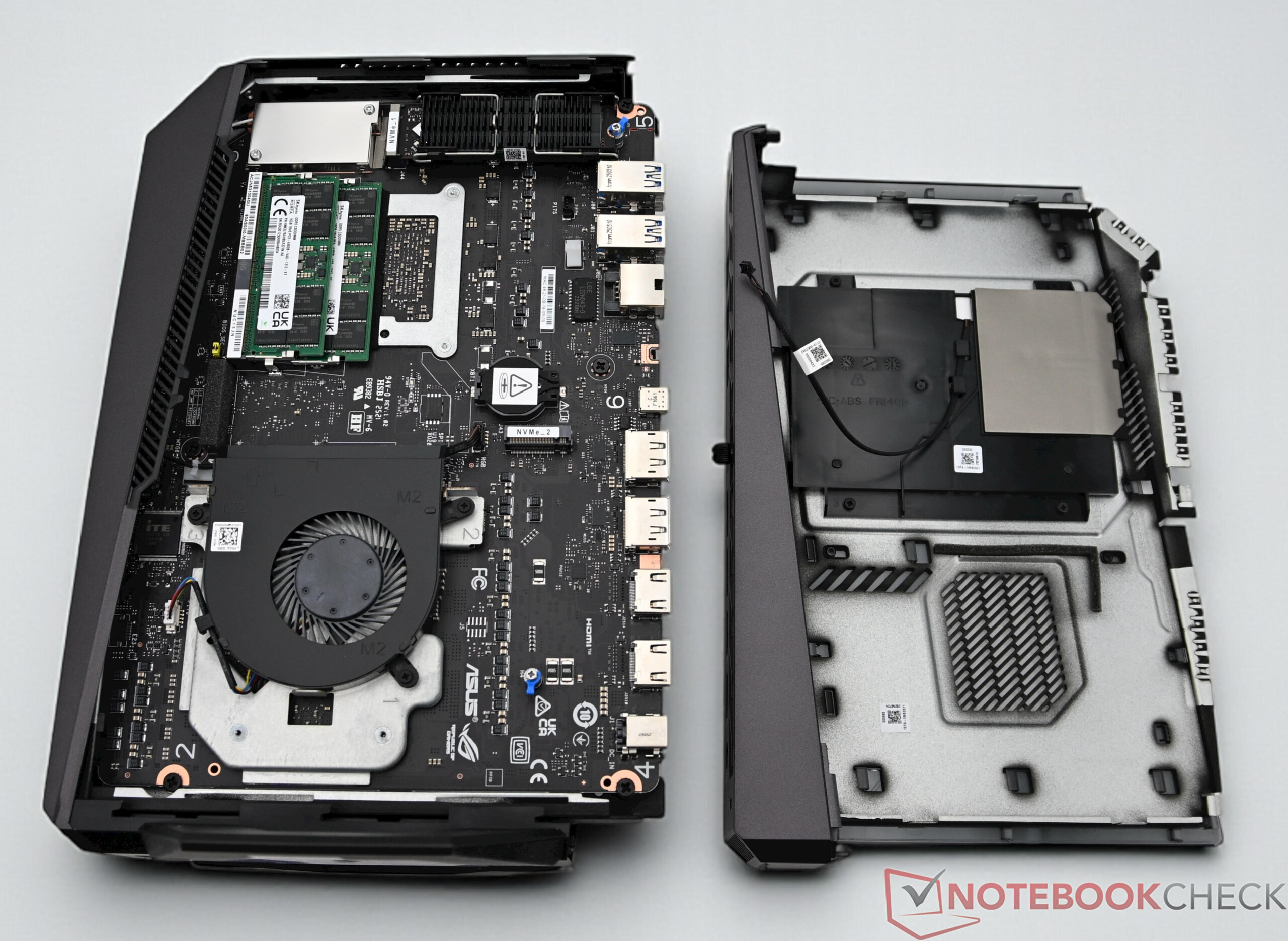 Maintenance work on the Asus ROG NUC 15 is possible without any problems. Asus dispenses with complicated screw connections so that the RAM and SSD are easy to access. After removing the side panel, there is space for up to two M.2 SSDs. The WLAN module can also be replaced if required.