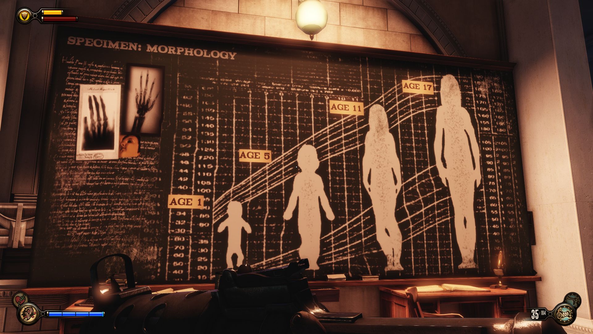 Irrational Games does not only indulge the gamer optically and acoustically but also historically – in the true sense of the word. Despite the rather simple main quest (find Elizabeth and care for her) BioShock offers quite a bit content wise. Those who do not simply run through are confronted with lots of US history: the period of slavery, war of independence, political and religious questions – the range is huge. Theoretically you can spend hours just with the unimportant details. The people of Columbia are set somewhere between the Ku Klux Klan and naive idealism – a rather unconventional topic for a computer game.