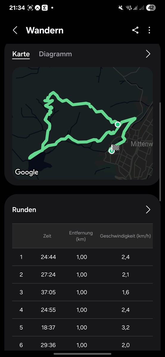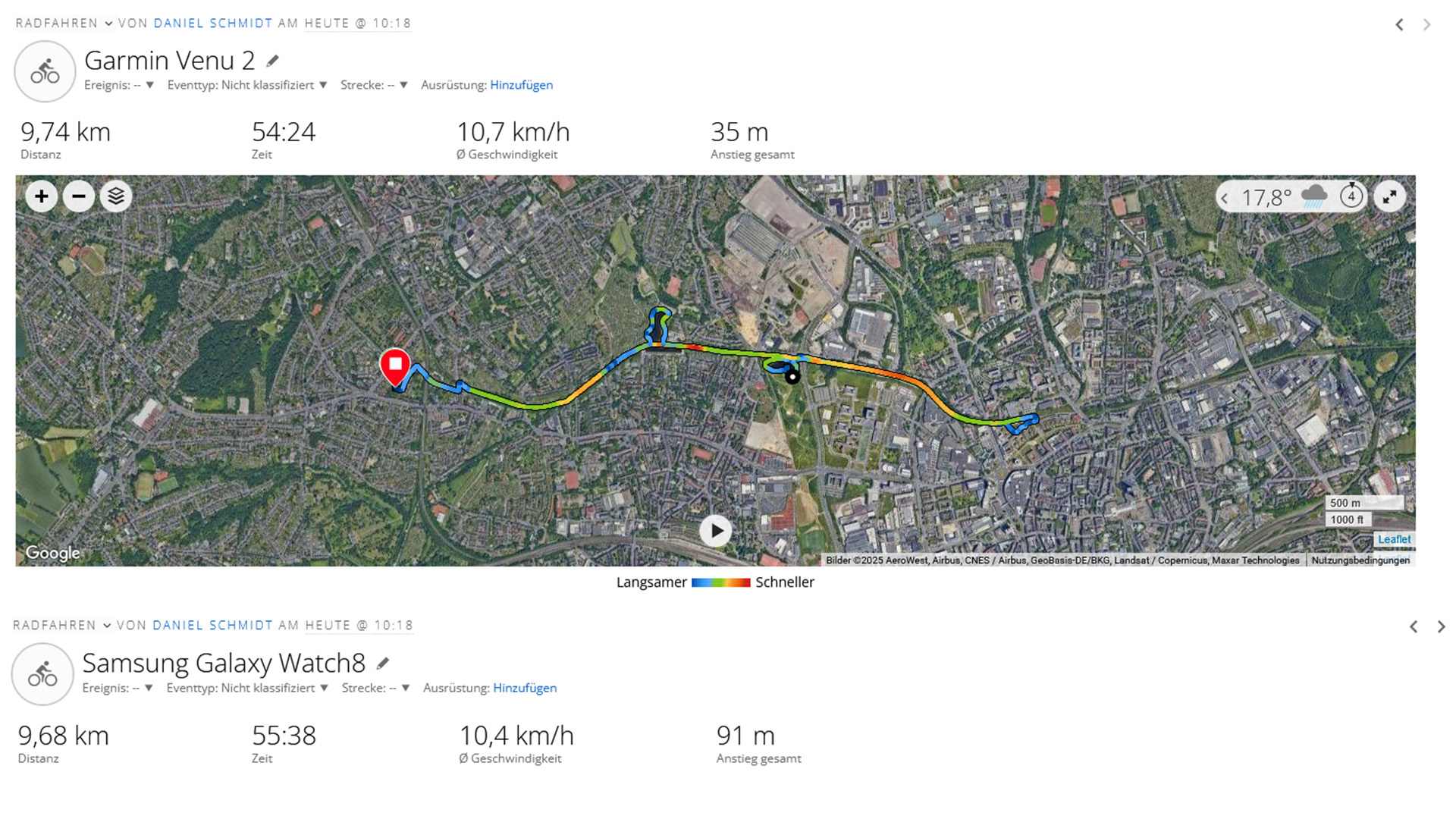 The traveled routes are recorded fairly accurately, even if the final precision is lacking particularly in curves. The Galaxy Watch8 comes with Google Maps preinstalled and using it for navigation works very well in everyday operation. The smartwatch supports navigation using the map or arrows. In our test, the satellite connection is stable and established quickly.