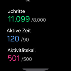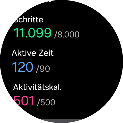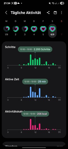In addition to the overview, there is information on the total amount of calories used, the traveled distance in kilometers, and the number of active hours and floors climbed. You can also follow the core values on timelines.