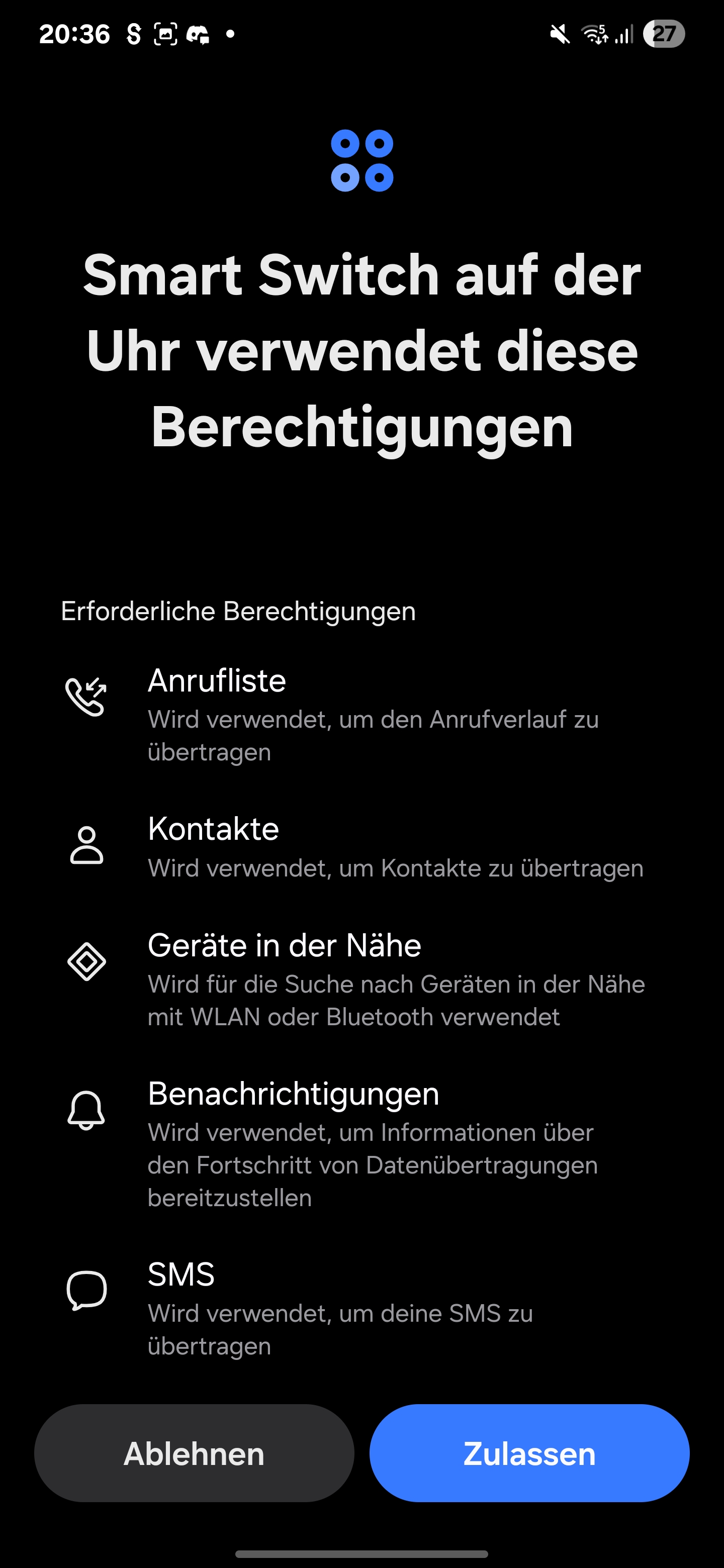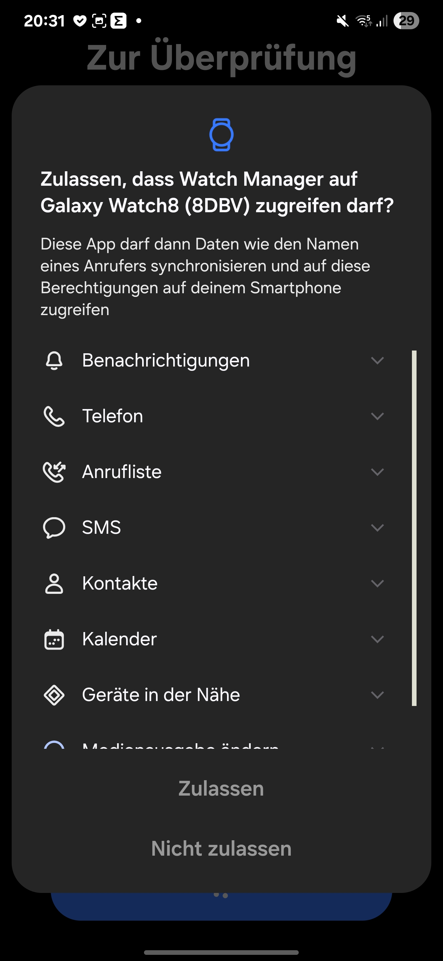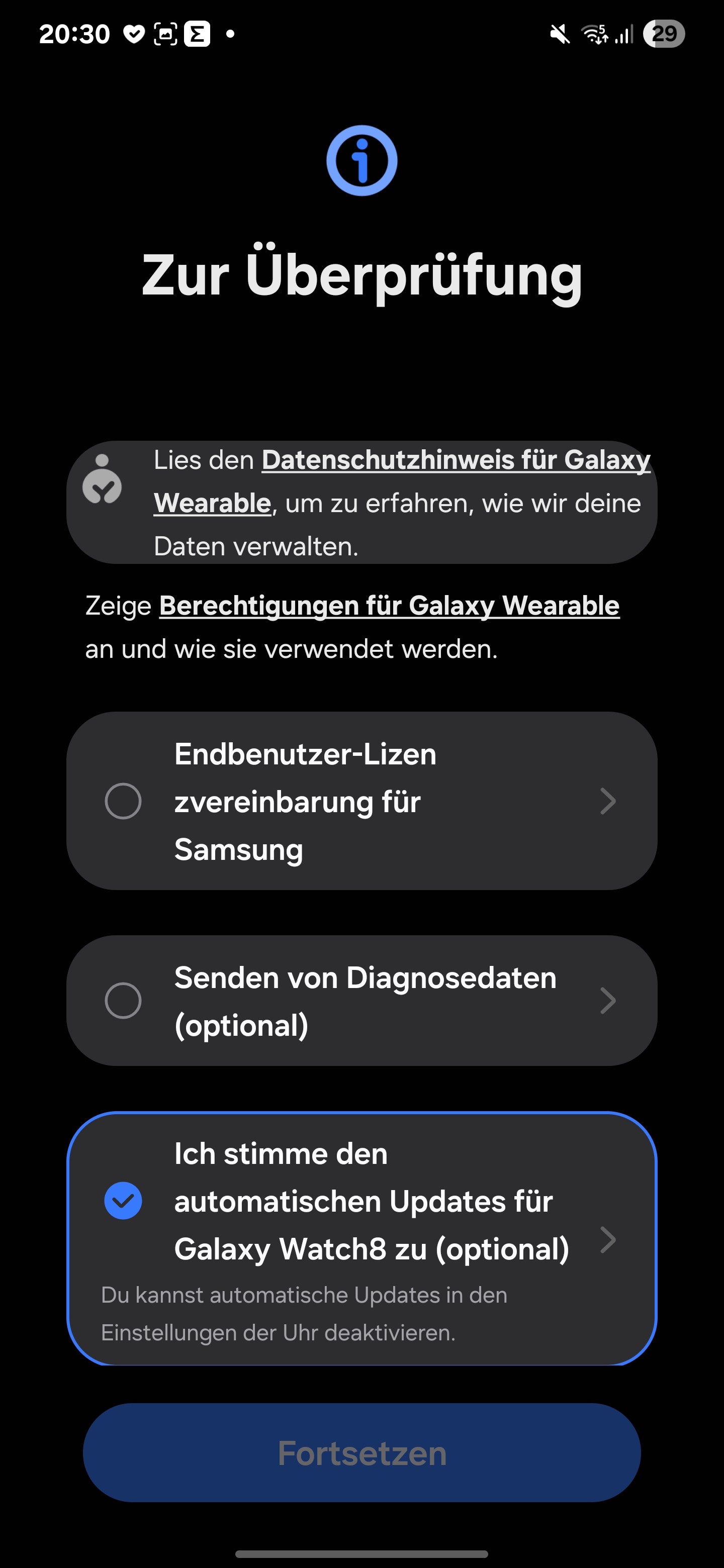 After turning it on, the Samsung Galaxy Watch8 is automatically displayed on Android smartphones nearby. In our test, we connect the smartwatch to a Samsung Galaxy S24 Ultra. The Samsung Wear app has to be installed as the software and an extension is downloaded for the Galaxy Watch8. During the setup process, a Google account is saved on the WearOS smartwatch, and you have to give a number of permissions.