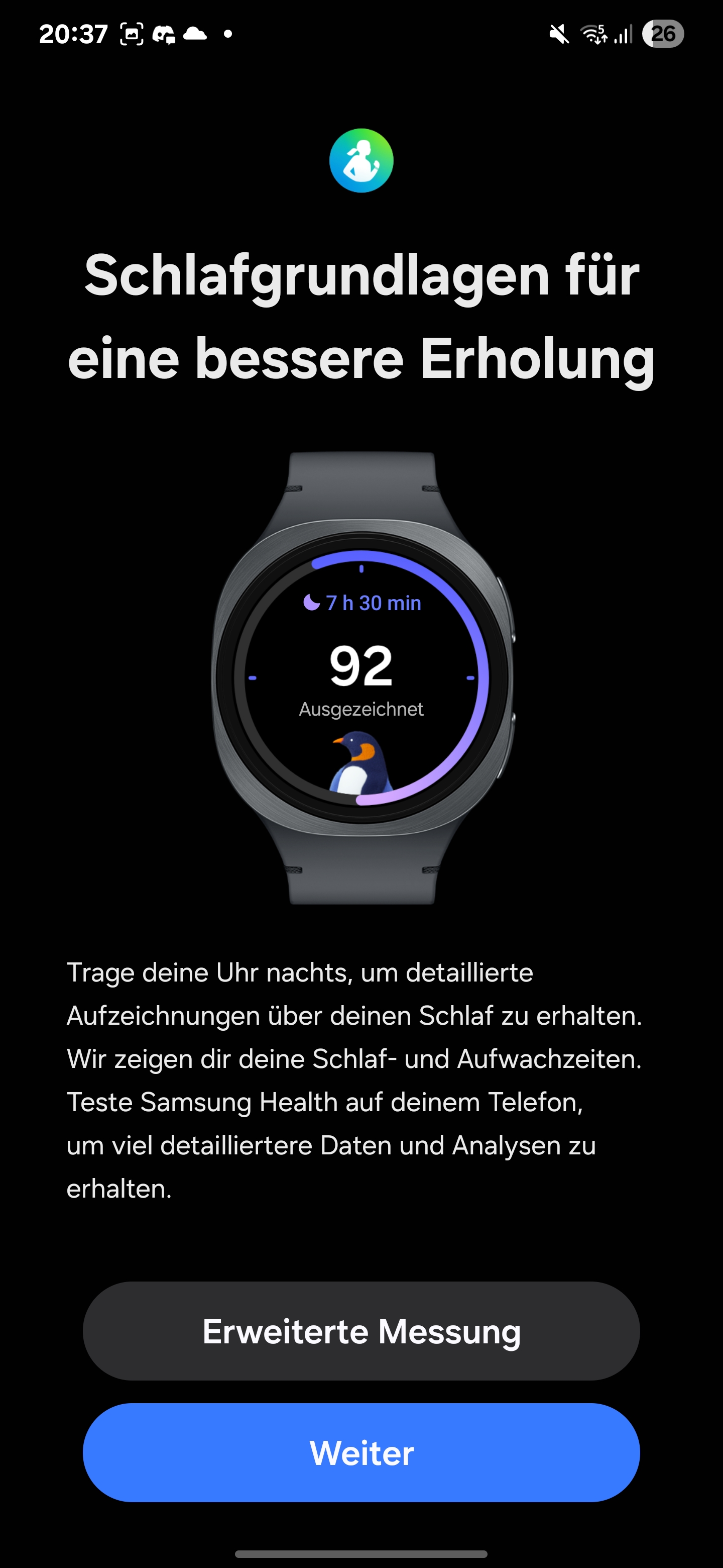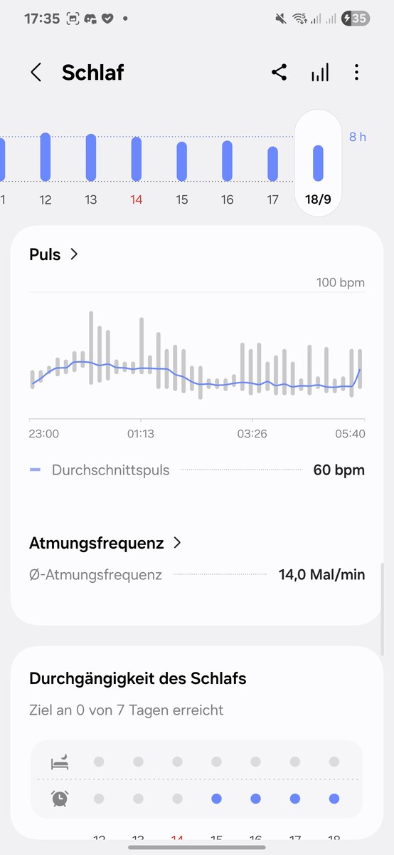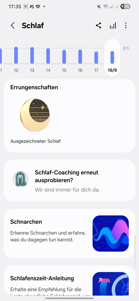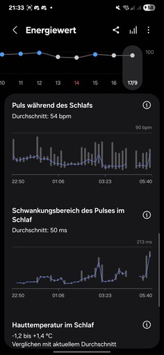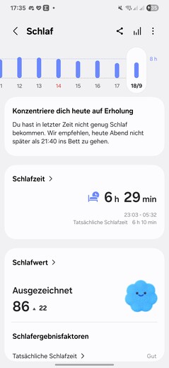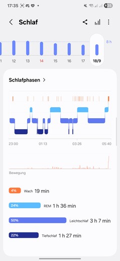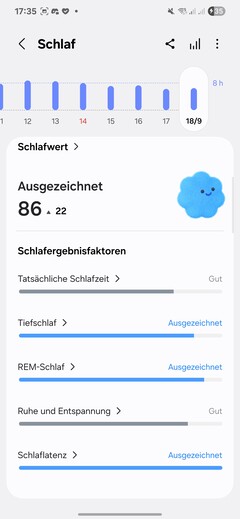 Samsung offers extensive sleep tracking, with the sleep score being in the center. This score is calculated from the areas of the amounts of times spent sleeping, in deep sleep, in REM sleep, and in rest and relaxation, as well as the sleep latency.