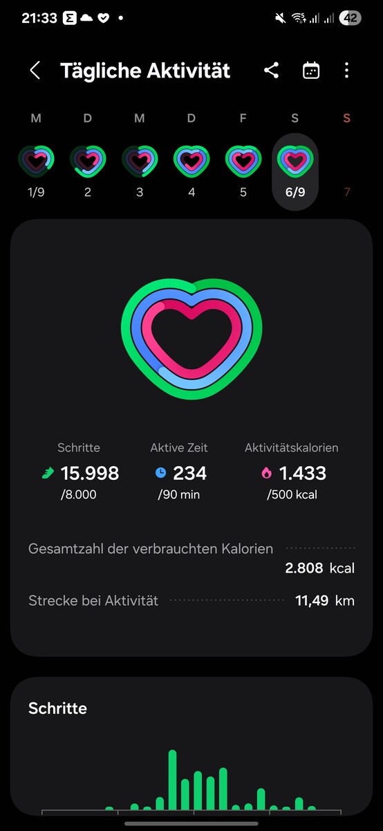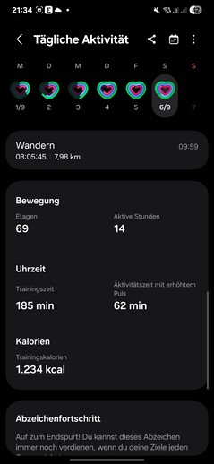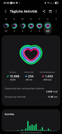 On the smartwatch itself as well as in the Fitness app, the Samsung Galaxy Watch8 displays the daily activity level in form of hears that are getting completed as the goals are reached. The software shows the values for the steps, activity times, and calories.