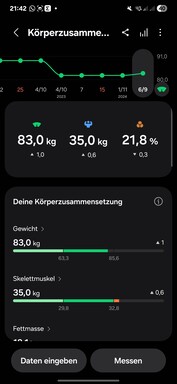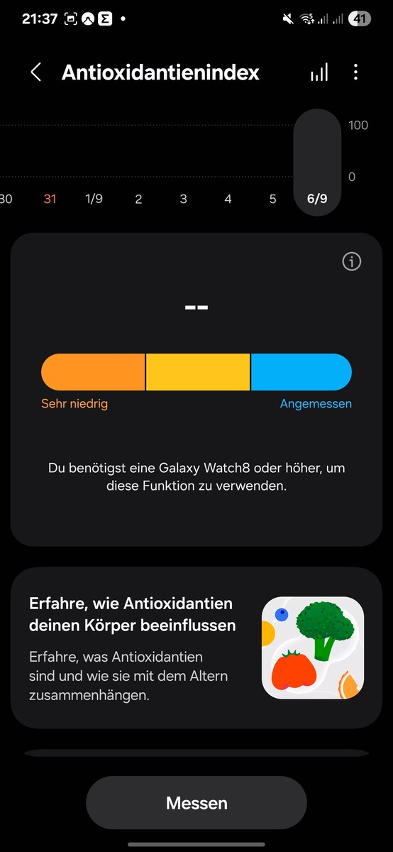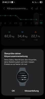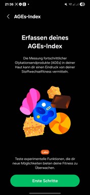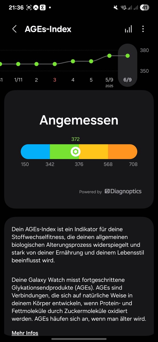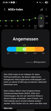 What is new is the AGEs Index, which is supposed to be an indicator of metabolic health and fitness. The value is displayed on a color scale, and there is also a qualitative rating and a point score. In addition, the Galaxy Watch8 is able to measure the Antioxidant Index, vascular load, and body composition.