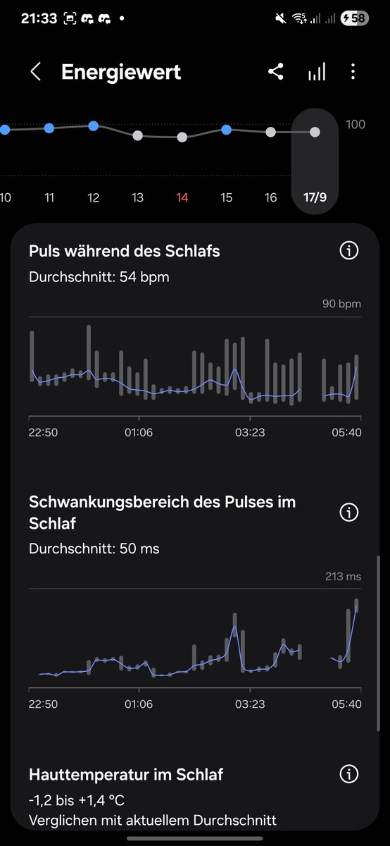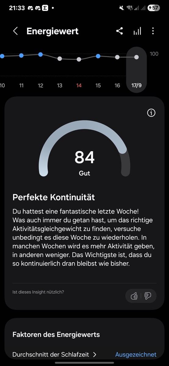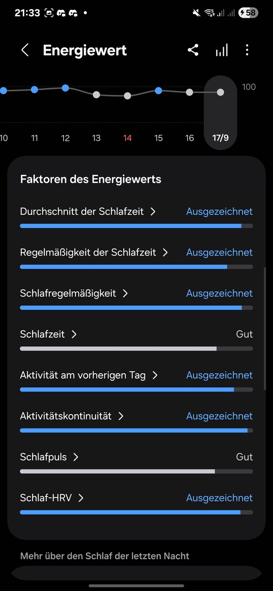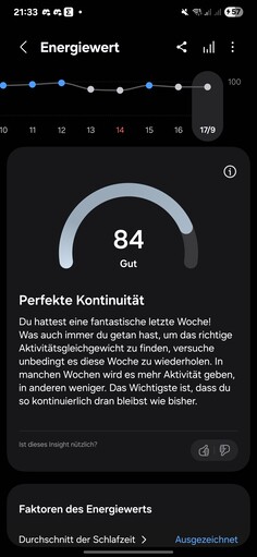 Samsung offers new health features with the Galaxy Watch8. The "energy score" is supposed to mean a lot. Based on sleep parameters and activity measurements, the score is supposed to tell you about the overall health and performance capabilities of the user during the day. In addition to the numeric point score, you also get a qualitative rating and a recommendation for the day. The graphic display of the day's values gives some information about trends.