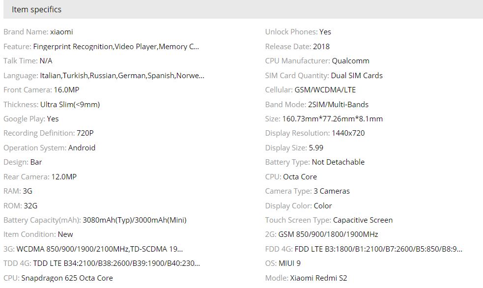 Going by the listing, the Redmi S2 will sport a 5.99-inch HD+ IPS display. It will be powered by the Snapdragon 625, and will feature 3 GB of RAM and 32 GB of storage. Camera-wise, it opts for a 12 MP + 5 MP dual rear camera setup and a 16 MP selfie shooter. A 3080 mAh battery gives it power, and is chargeable via a Micro USB port, by means of a 10W charger.