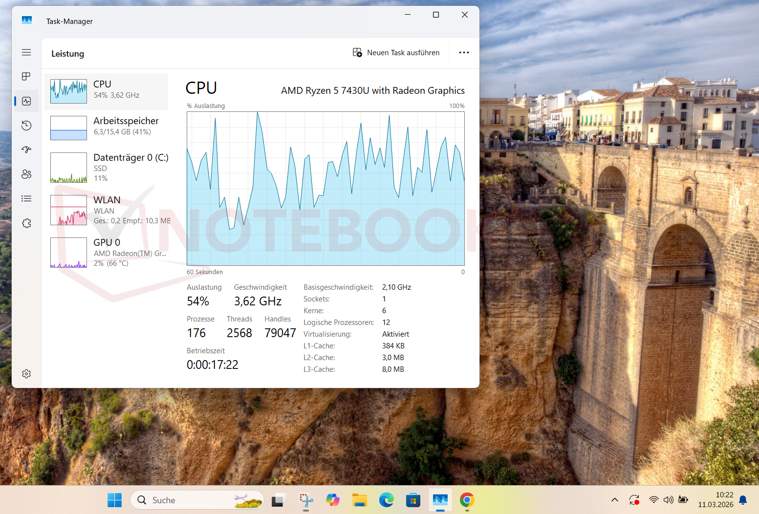 The Windows Task Manager provides an initial indication. Both the clock rates and the CPU caches can be viewed here. The Ryzen 5 7430U has a maximum boost clock of 4,300 MHz and 16 MB L3 cache and comes from the Zen 3 processor series, codenamed "Barcelo-U". In the task manager of our sample, however, the information differs. Although the CPU name is given as Ryzen 5 7430U, the codename "Lucienne-U" (Zen 2 architecture), the L3 cache of 2x 4MB and the observable turbo clock of max. just over 4,000 MHz indicate inconsistencies. These specifications correspond to the Ryzen 5 5500U chip.