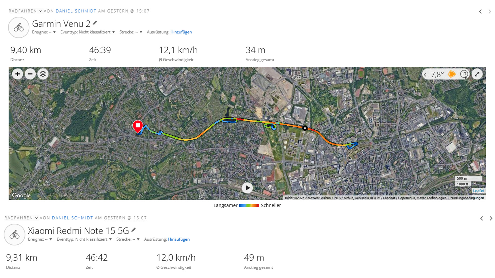 During a bike ride, we compared the Xiaomi smartphone with a fitness smartwatch from Garmin. The recorded route is mostly accurate, although some deviations from the actual path are visible.