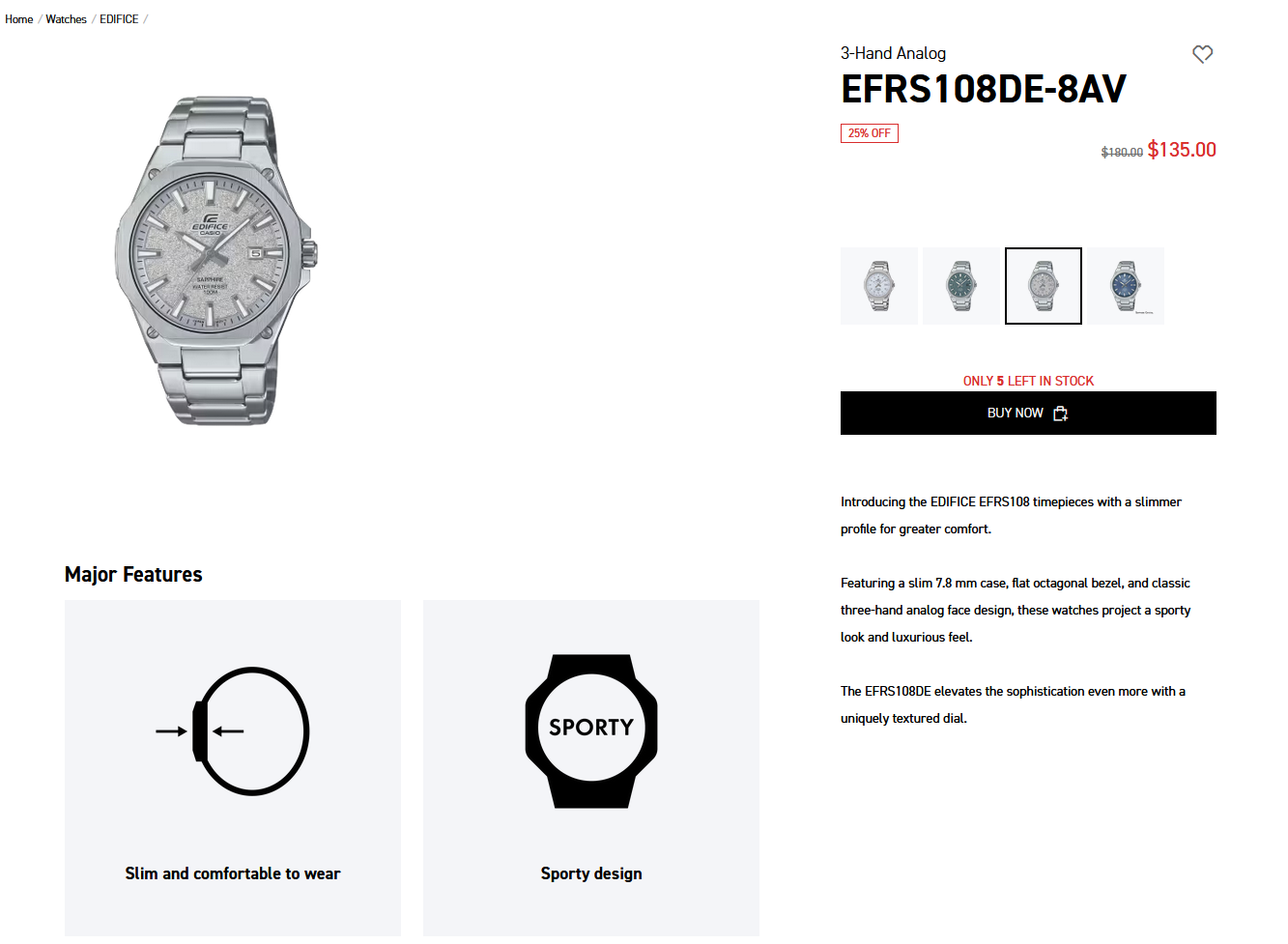Casio’s Edifice line often sits in a quiet (yet established) corner of the brand’s catalog, but every now and then, a model pops up with a great mix of design, price, and practicality. The EFRS108DE-8AV is one of those cases, and it’s currently listed at $135, down from its regular $180, which is interesting considering the lineup was introduced only a few months ago. The discount brings a slim stainless-steel watch into impulse-buy territory, and the listing shows only five units remaining.
