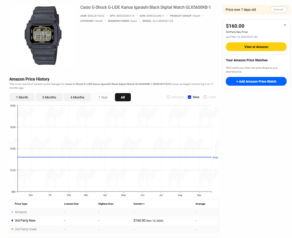 The GLX5600KB-1 ships in a special packaging alongside a manual and warranty card. Camelcamelcamel price tracking history (below) shows its $160 price point until the recent drop to $127.41, which isn't even documented online as of writing.