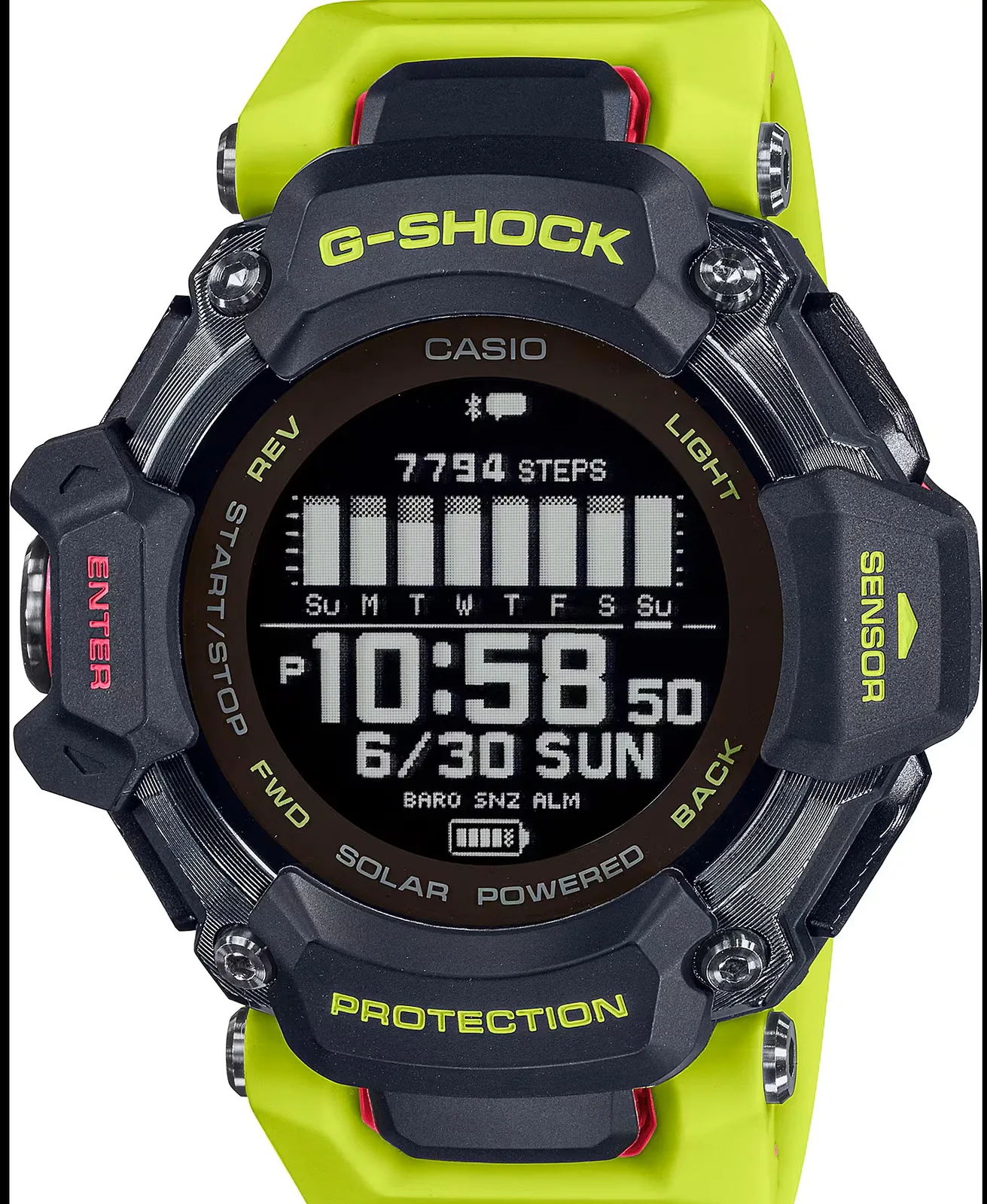 The main highlight of the watch is the solar-assisted charging, which offers up to 19 hours of power reserve with GPS and heart-rate tracking and up to 23 months in power-saving mode. Another nice-to-have is Bluetooth connectivity, meaning you can connect the watch to the Casio Watches app (available for both Android and iOS) to further access the features, such as auto-time adjustment across 300 world cities and phone-finding functionality.