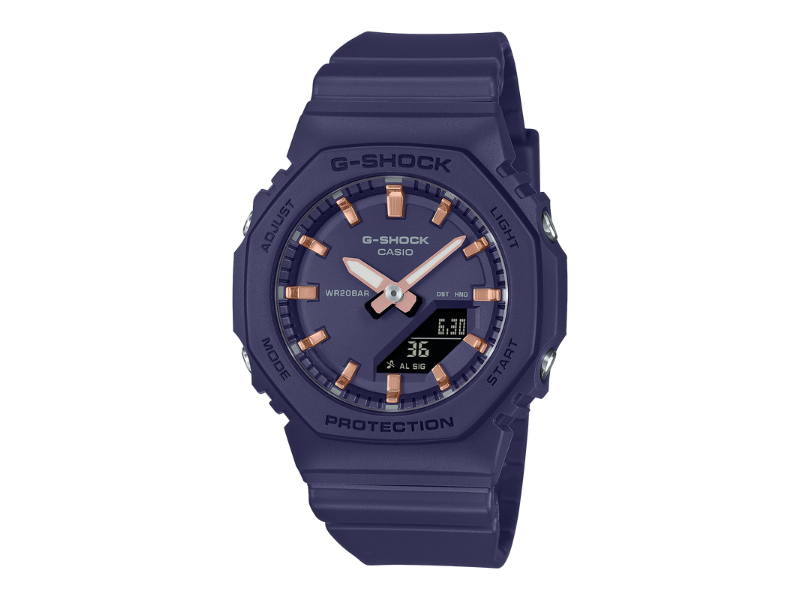 Casio's GMA-P2100 are hybrid watches with a small inset digital display. Users can choose from 48 time zones for cities worldwide, with the time shown in 12 or 24-hour formats on the display. A hand-shift function ensures you can always read the smaller screen, temporarily moving the hands out of the way. The display also indicates what mode you are in and shows the date, month and day.
