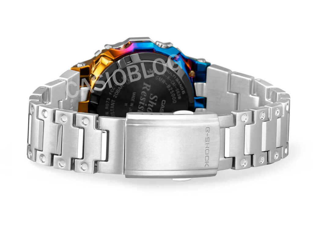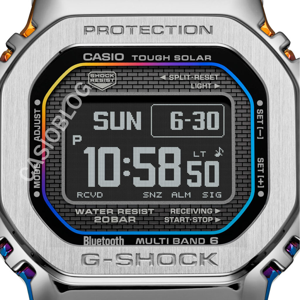 The super-clear updated renders show how Casio is handling the rainbow ion-plated finish in more detail. Instead of a fully colored case, the accents are applied selectively across structural edges of the case, particularly along the lower and side segments. Blue and purple tones are more prominent in the bottom half. That transitions into warmer gold and orange hues near the top lugs and bezel joints.