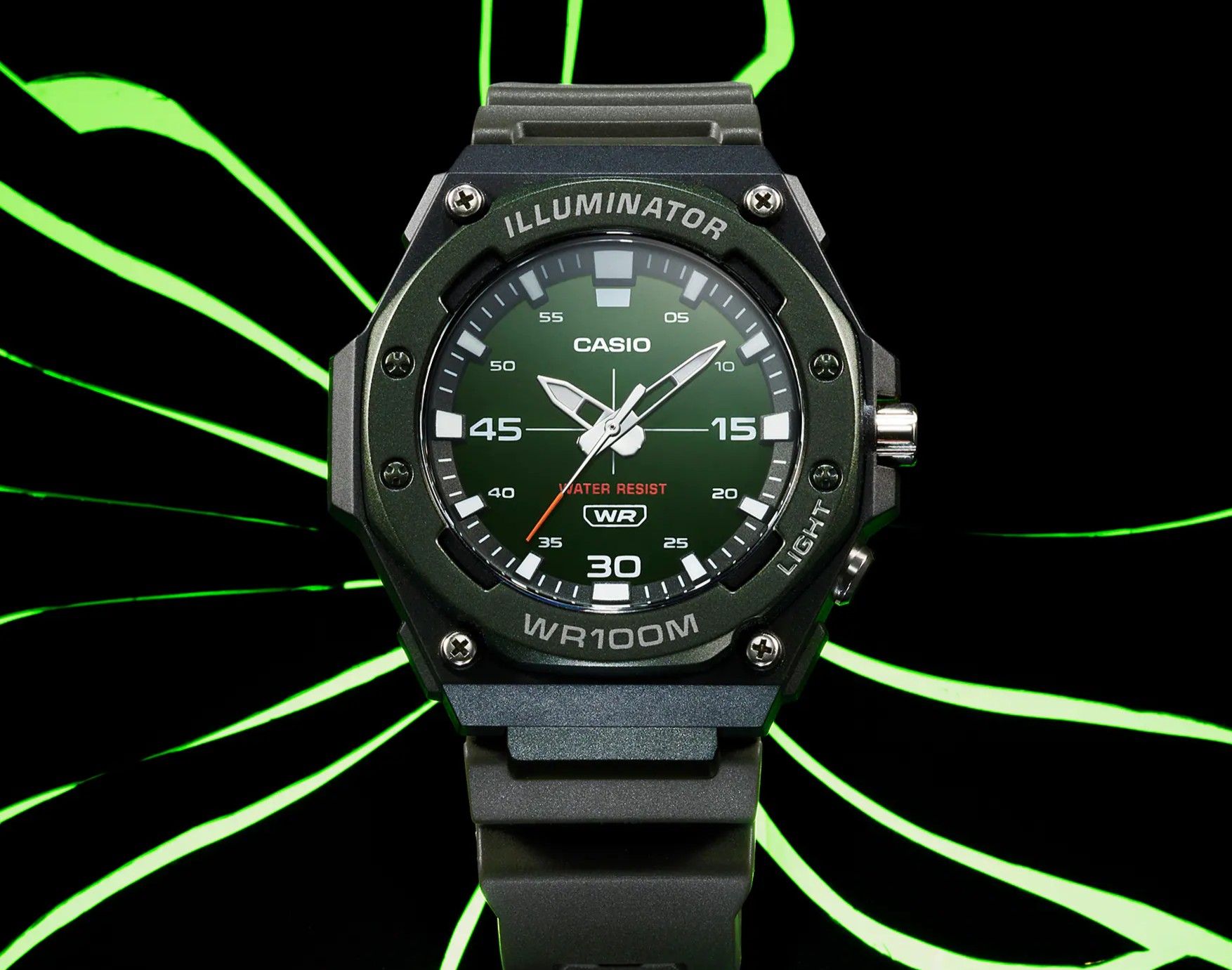 The Casio MW-620H-3AV has a bold, sporty design, featuring a 46.1 mm barrel-shaped resin case and resin band for enhanced toughness. The case is complemented by a metallic-finished resin-made octagonal bezel with some printed texts, which adds a sleek touch. The green sunray dial features lume-coated hour, minute, and second hands. Casio also offers an LED light with afterglow, ensuring better visibility even in low-light conditions.