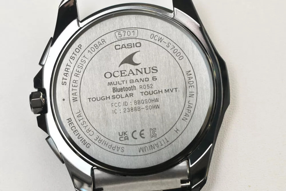 The side profile shots show a relatively slim case considering the feature list, and the lug shape looks like it should wear comfortably. The pushers and crown have a clean, angular build, and the crown has an engraved Oceanus symbol. The caseback shows Bluetooth, Multiband 6 radio sync, Tough Solar, sapphire crystal and 10-bar water resistance.
