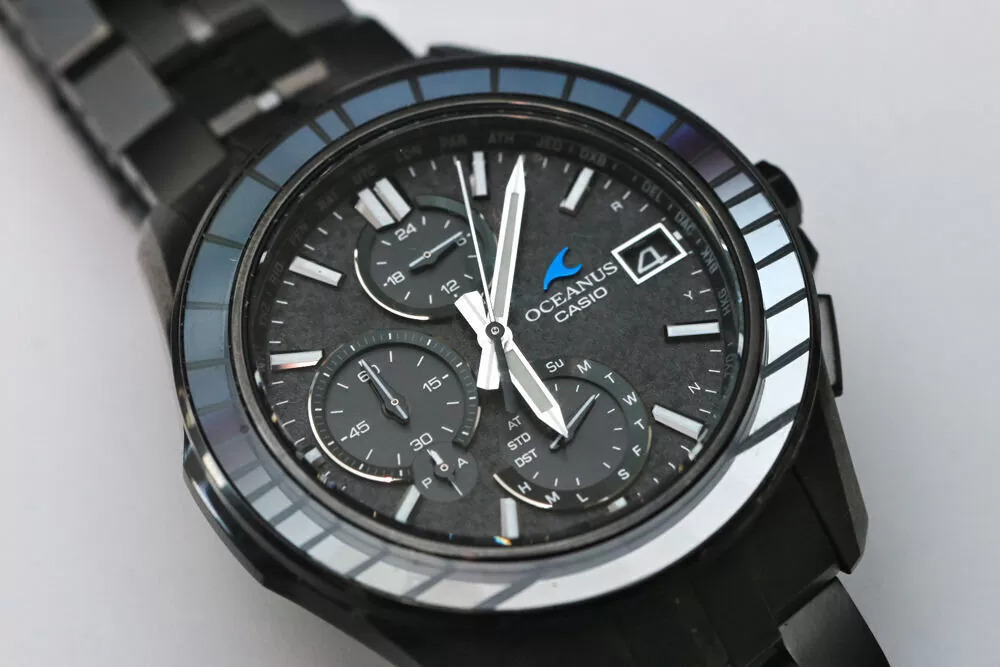 The dial is more interesting in these real photos too. Instead of looking flat and uniform, the surface has a textured, almost stone-like appearance that shifts under light. The sub-dials and markers pop out more clearly, and the framed date window at four o’clock looks far more refined in person. The bright blue Oceanus wave logo is striking against the black background - much more noticeable than in the original press images.