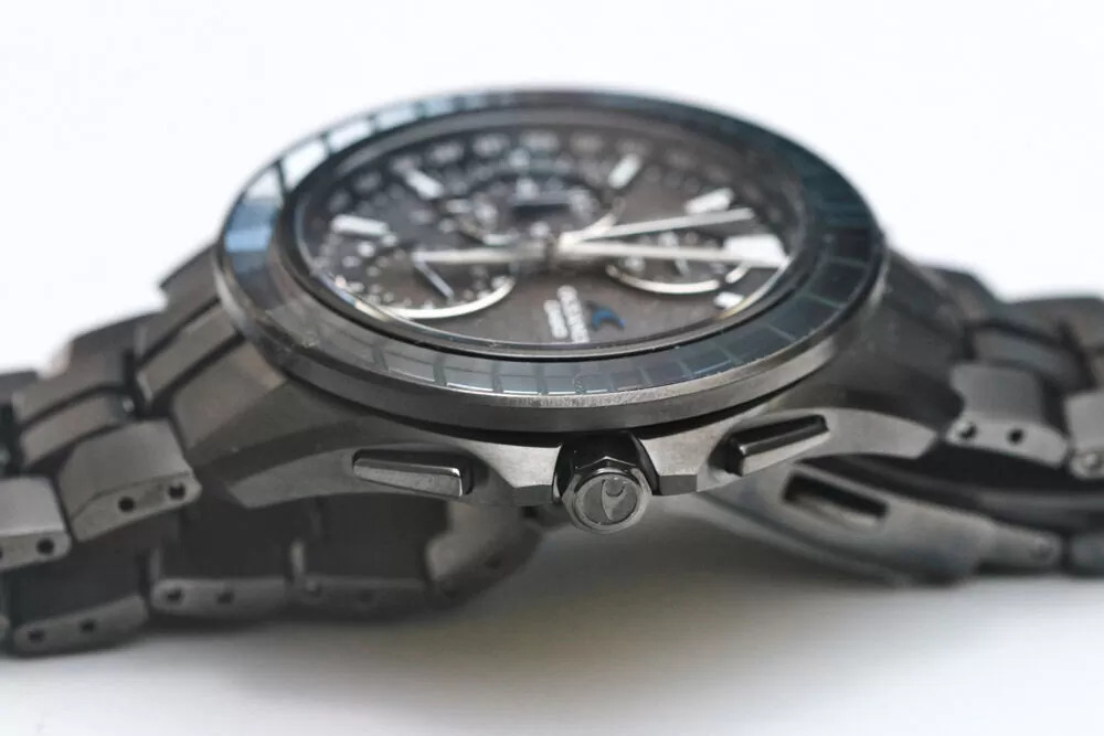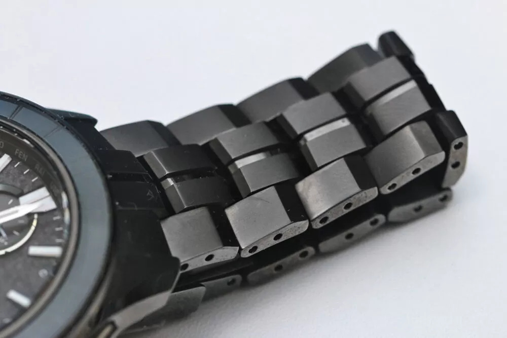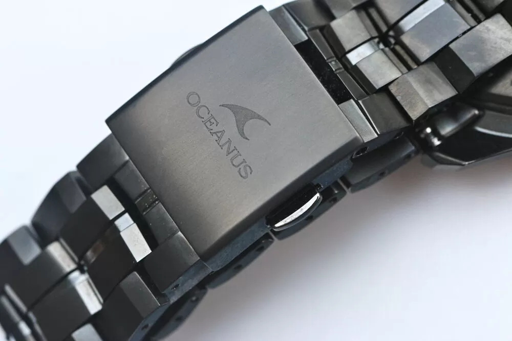 The first thing that catches attention is the case and bracelet. The watch seems to use a full titanium build with a black DLC finish, and the close-ups show sharper edges and more complex machining than usual. The bracelet links have noticeably angular facets, and the brushing looks deep rather than lightly painted on. The clasp shot also shows a nicely engraved Oceanus logo, with a matte texture that complements the reflective polishing around it.