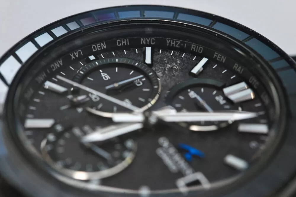 But the main takeaway from these angles is the sapphire bezel, which will be a big selling point for this watch. The facets around the bezel pick up light and shift between dark blue and silver tones depending on the angle. It’s the kind of detail that doesn’t really translate well in studio renders but looks impressive in real life. You can also see the world-time city abbreviations underneath the inner edge of the bezel - NYC, RIO, DEN, HNL and others.