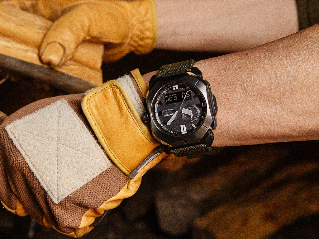 This model is great for fans of the outdoors, and adventurers who need reliability and advanced features. The PRW-6900YB-3CR has a robust octagonal metal case, black ion-plated bezel, and a flame-resistant Cordura band in khaki green. At 44.8mm in diameter and 14.7mm thick, it maintains a presence on the wrist without becoming "too much", and weighs just 67g thanks to its lightweight, bio-based resin and stainless steel construction. The dial has a textured finish, alongside an orange seconds hand.
