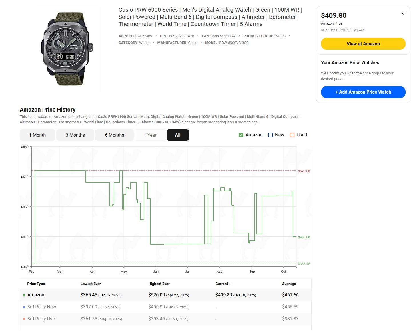 Casio's Pro Trek series is arguably its second most popular outdoor line, next to G-Shock. If you have been in the market for a Pro Trek model lately, PRW-6900YB-3CR is currently available on Amazon at a big discount, dropping from its usual list price of $520 to $409.80, with half the deal slots already taken as of writing. Going by camelcamelcamel's price tracking history, it is one of the lowest seen prices for this model in recent months.