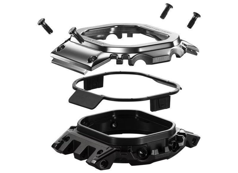 Casio says the watch is co-designed with the help of AI, drawing from 40 years of shock-resistance data. Unlike previous full-metal G-Shocks, in which the metal bezel fully covered the center case, Casio’s newly designed structure connects the bezel and the center case at the top and bottom, while placing a highly resilient resin in between, which temporarily deforms to absorb shocks. The watch is manufactured at Yamagata Casio in Japan.
