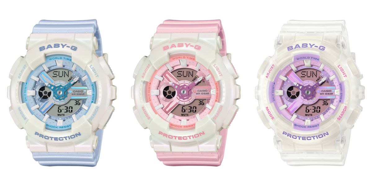 Three new Casio G-Shock Baby-G BA-100 series watches have been launched in Japan. Also set for release in other markets globally, the BA-110PD-2A, the BA-110PD-4A and the BA-110PS-7A have pastel colored designs, and are marketed as “highly practical and seriously functional”.