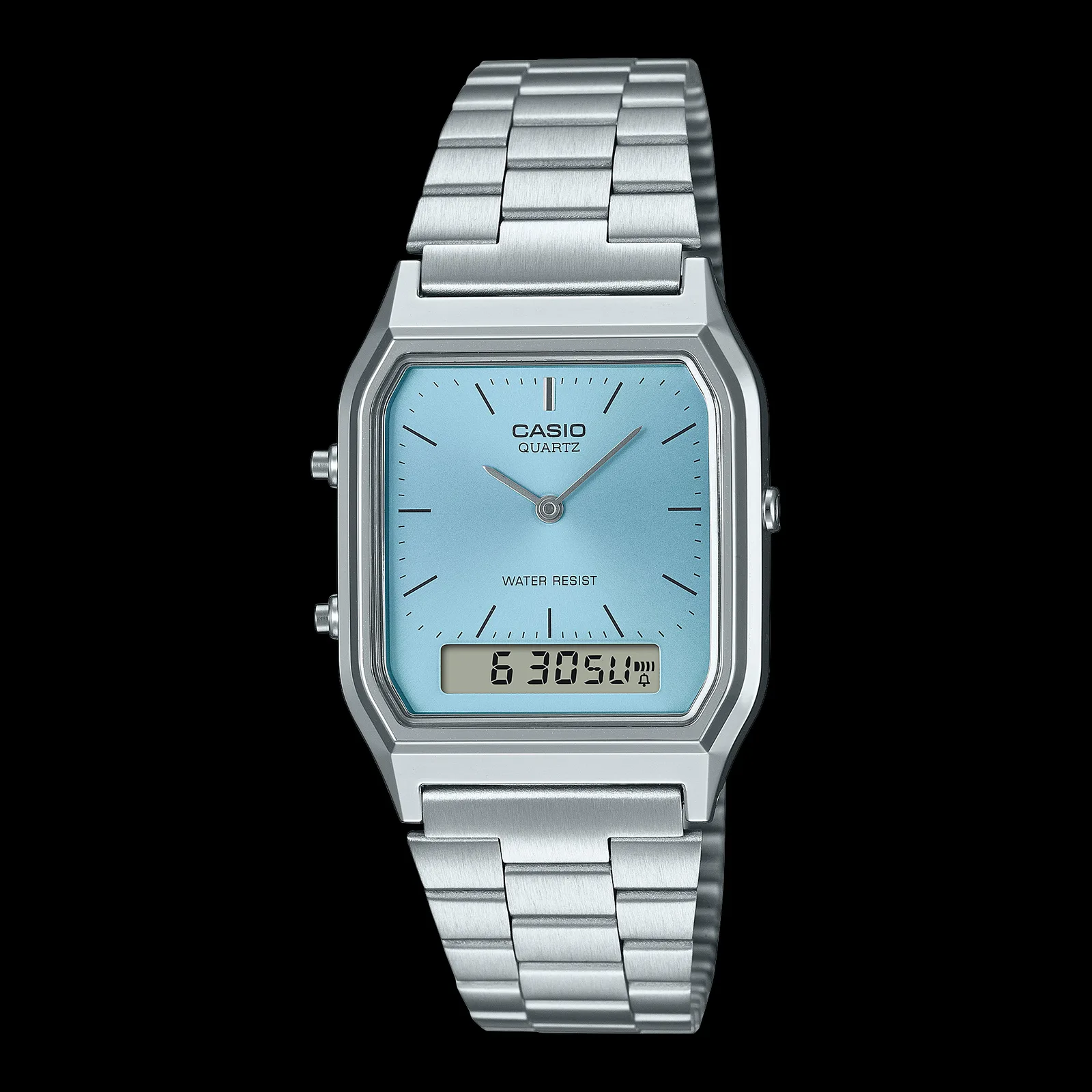 Having recently listed the new GGB100X Mudmaster watches for sale on the US website, Casio is also updating its Vintage lineup in the region with the release of the Casio AQ230A-2A1M. The new analog-digital watch is now listed on the official US Casio website with a retail price of $59.95. This series is known for its slim rectangular case and hybrid time display. The watch measures 38.8 × 29.8 × 8.1 mm and weighs 47 g, which makes it one of the lighter stainless-steel options in the company’s retro catalog.