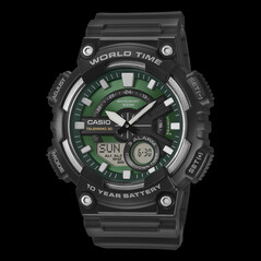 For users who need more data from their watches, the AEQ-110W-3A2V has a hybrid analog-digital display. Its main technical metric is a 10-year battery cycle powered by a CR2025 cell. The module includes legacy features such as a 30-entry Telememo database and world time support for 30 cities. At 16.7 mm, it is the thickest model in the collection, which is more of a necessity because of the internal stacking required for the LCD and mechanical hands. Despite all this, it still has the 100-meter water resistance found in the analog-only model.