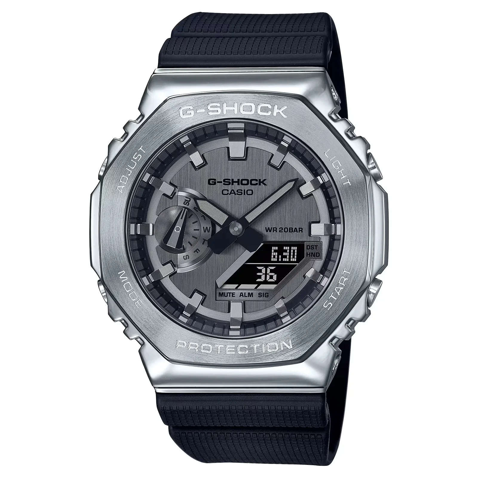 The Casio G-Shock GM-2100-1A watch stands out thanks to its sporty, metal-clad design, making it ideal for outdoor enthusiasts and daily wearers. The watch’s resin case and a stainless steel octagonal bezel with a rounded hairline finish are paired with G-Shock’s sturdy and durable shock-resistant construction. The metallic accent, gray dial, and black resin band add a classy touch to the watch.