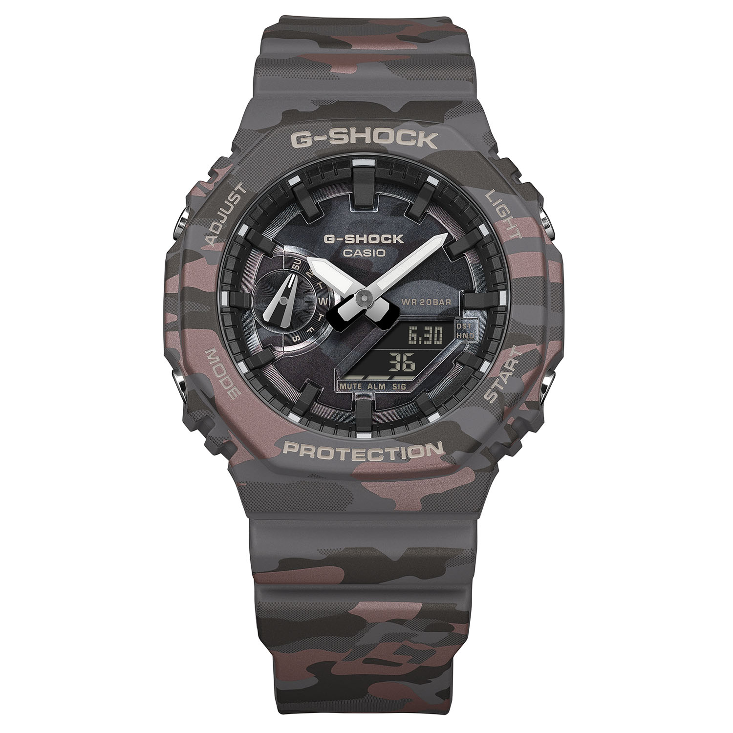 Casio's GA-2100 series, which is characterized by its octagonal bezel and hybrid analog-digital display, is now officially receiving three new colorways: sand (GA-2100CM-5), grey (GA-2100CM-8), and a third variant using reddish tones (GA-2100CMD). There is metallic print on the resin components as well. This manufacturing process renders a multi-layered camouflage effect that includes the brand identifier - the G-mark - integrated directly into the pattern. While previous iterations of the GA-2100 used molded color resin or standard pad printing, the use of metallic detailing on these models is intended to provide a higher degree of visual depth compared to standard variants.