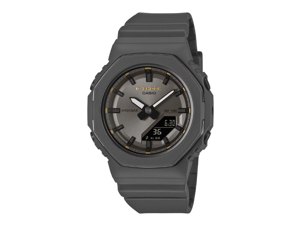Casio's G-Shock GMAP2126W-8A is an analog-digital watch with two analog hands set on a dark gray metallic dial with gold colored accents. It is said to remain accurate to within 15 seconds per month, and a hands shift feature ensures that the inset digital display is never obscured. The screen shows information about the date and day of the week. Plus, this model offers tools like a countdown timer, a 1/100th second stopwatch, alarms and hourly time signals. Users can choose from a list of 48 cities to adjust the time zone. It is also worth noting that the model is water resistant to 200 m.