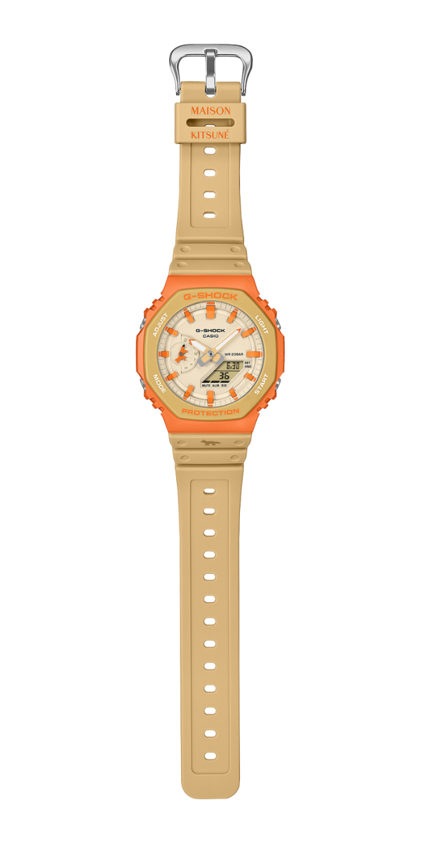 The Casio G-Shock GA-2110MK-5A has a camaieu, or monochrome, palette, said to be inspired by Haussmann’s Parisian architecture. The design centres around the Maison Kitsuné fox motif, which can be found on the day of the week sub-dial. In a matching bright orange are the watch’s bezel and various accents on the lighter dial. The resin watch measures 48.5 x 45.4 x 11.8 mm (~1.91 x 1.79 x 0.46 inches), with a striking orange bezel, and the strap features the Maison Kitsuné logo.