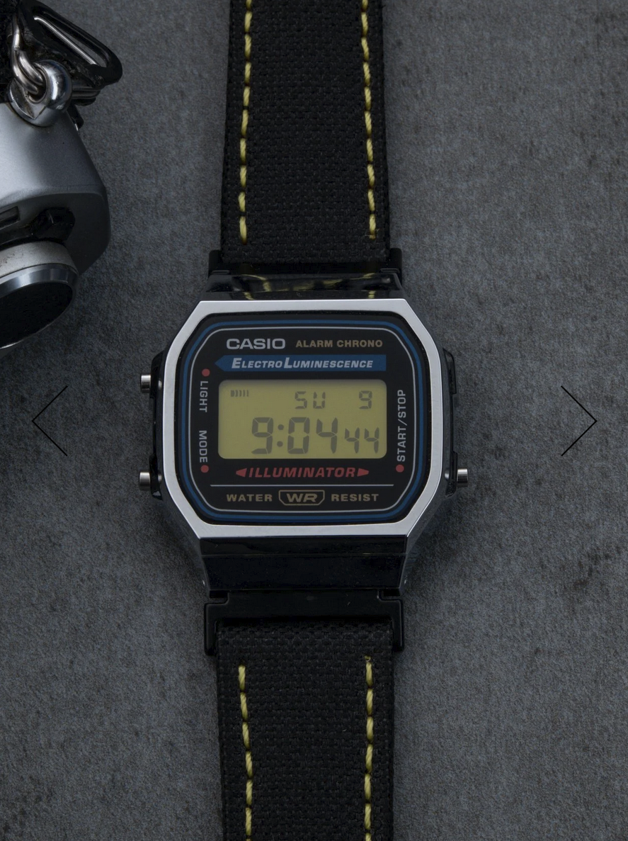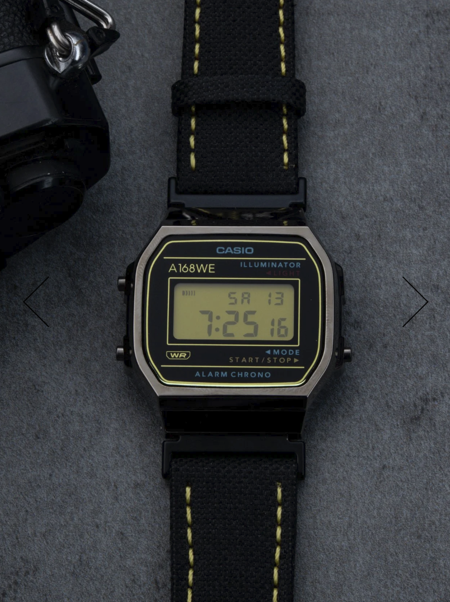 The underlying watch hasn’t changed. It still uses the standard A168 digital module with alarm, stopwatch, and backlight. There’s no indication of any functional upgrades, so the focus here is clearly on style and design rather than bonus features. The display has a yellow tint, which is a clear reference to Nikon’s color. The strap uses black canvas with yellow stitching, very similar to camera straps. The case shape stays close to the original. Branding like "Illuminator" is still visible, which makes it clear this isn’t a full redesign.