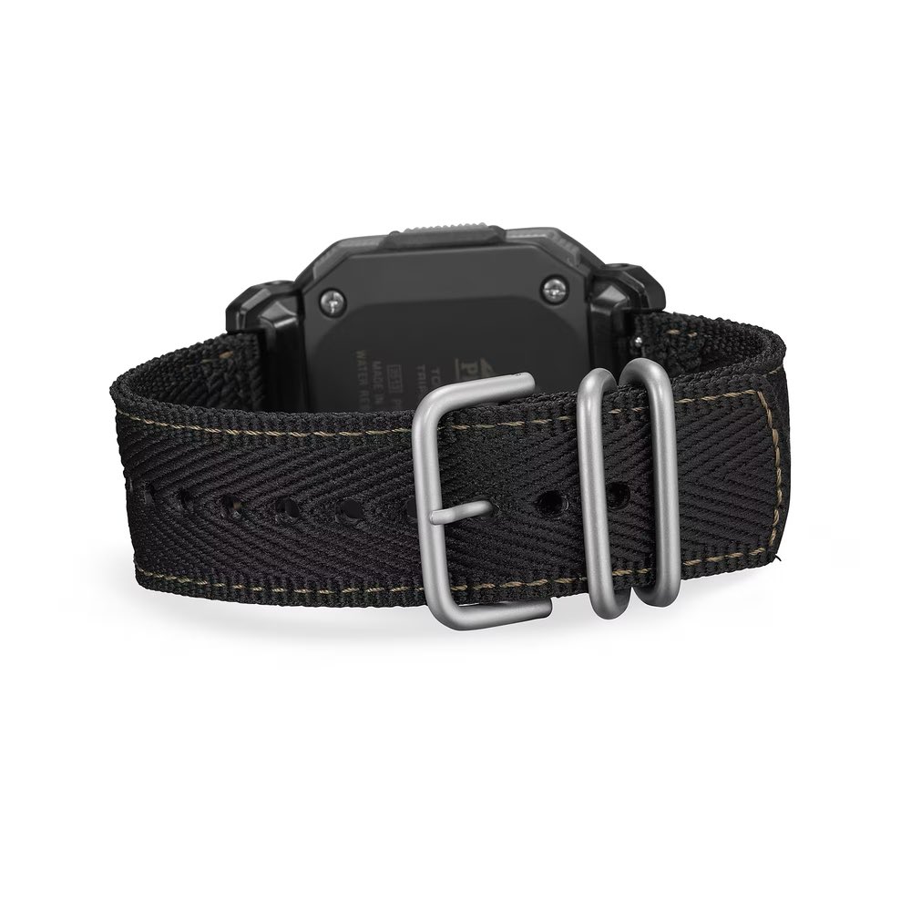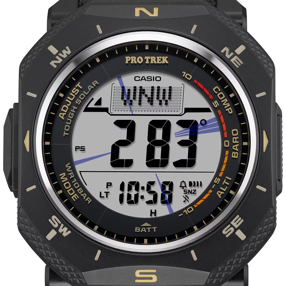 The newly revealed PRG-69B-1 is functionally identical to its square siblings, sharing the same flame-retardant, bio-based case and dual-layer “Duplex” LCD. Where it differs is its band. Unlike the PRG-69-1 and PRG-69-4, which use bio-derived urethane strap, the PRG-69B-1 ships with a cloth band made from recycled PET plastic fibers, giving it a more outdoorsy look. Another visual difference is the gold-accented compass markings on the bezel, whereas the PRG-69-1 and PRG-69-4 feature orange and white accents, respectively.