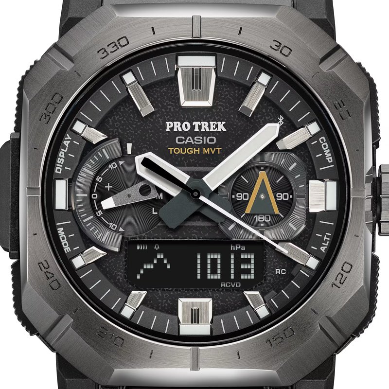 Notably, the PRW-B1000-1 comes equipped with both Bluetooth and Multiband 6 radio control. This means you get precise timekeeping whether you are syncing with your smartphone or relying on radio calibration signals deep in the backcountry. The Bluetooth integration also unlocks a clever Location Indicator feature. For example, you can mark a spot in the app—like where you parked your car at the trailhead—and the indicator hand in the inset dial at the 3 o’clock position will physically point you back to it with the dot-matrix LCD displaying the distance from your current location.