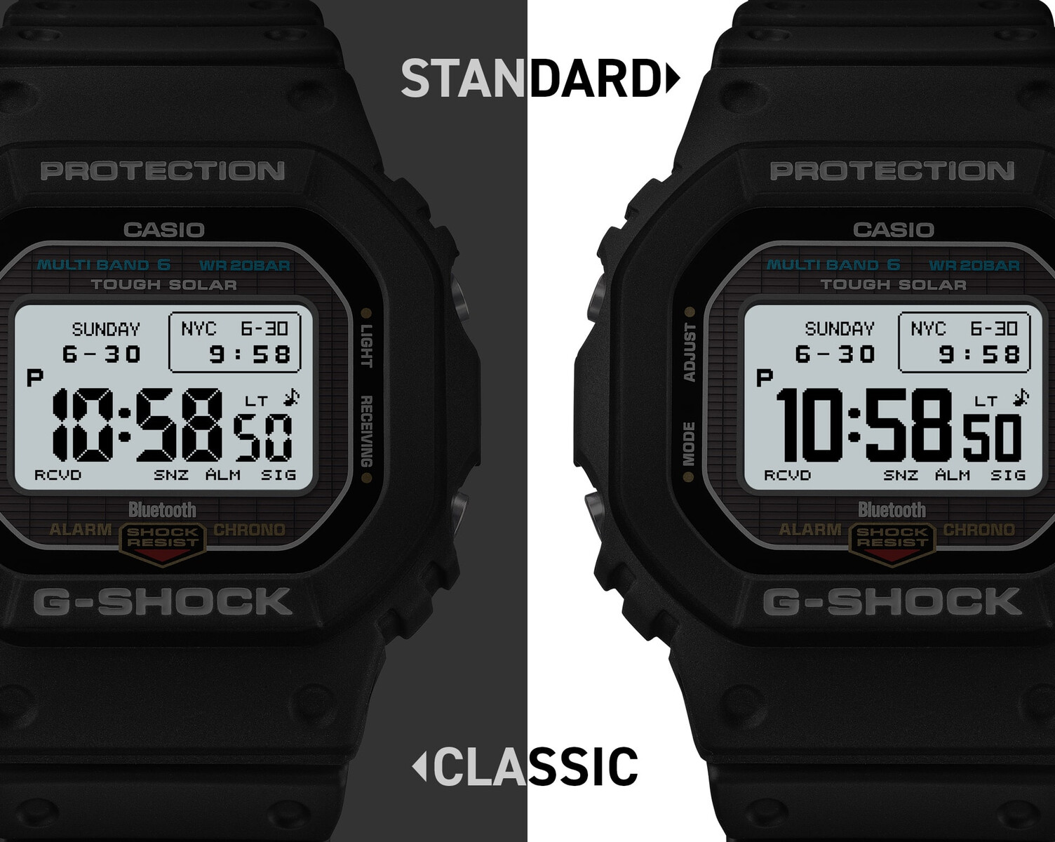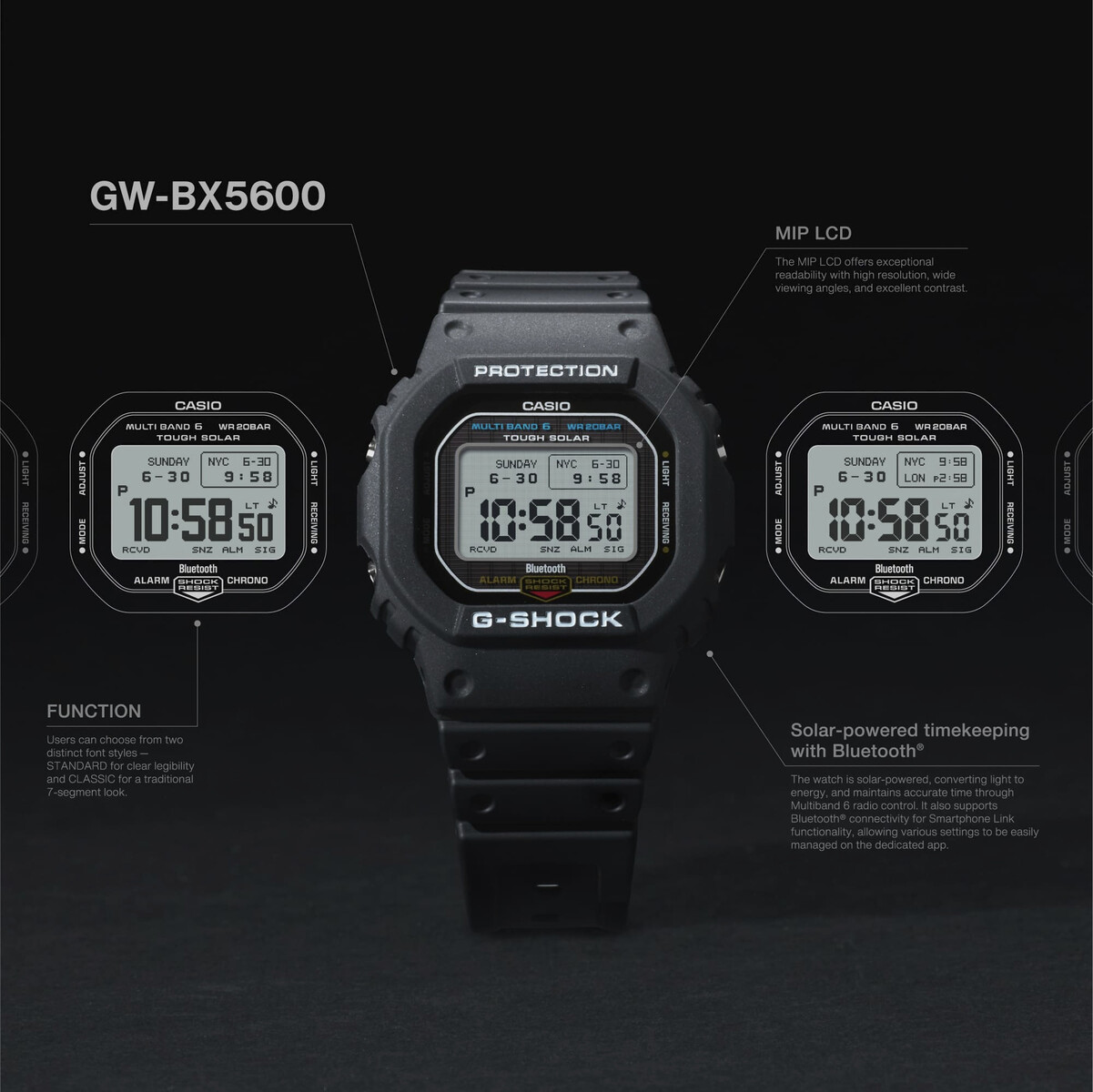 Functionality steps up with full Tough Solar charging, Multi Band 6 atomic time sync, and now Bluetooth, so users can now sync their watch with a smartphone for instant clock correction and access to the Casio Watches app for display format control, time and place logging, and more. The MIP LCD supports multiple display layouts switchable through the app - now, users can customize info density and contrast.