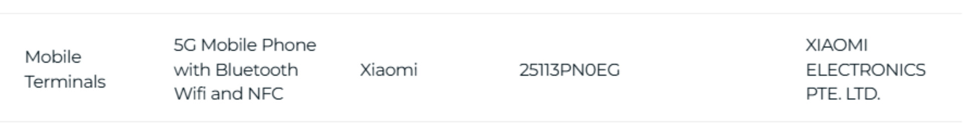 Now, what appears to be the global version of the Xiaomi 17 has turned up on the Infocomm Media Development Authority (IMDA) public database in Singapore. Specifically, the regulatory body has certified '25113PN0EG', as the picture below shows. Based on Xiaomi's model number nomenclature, 25113PN0EG should be the global version of 25113PN0EC, a model number assigned to the Chinese version of the Xiaomi 17.