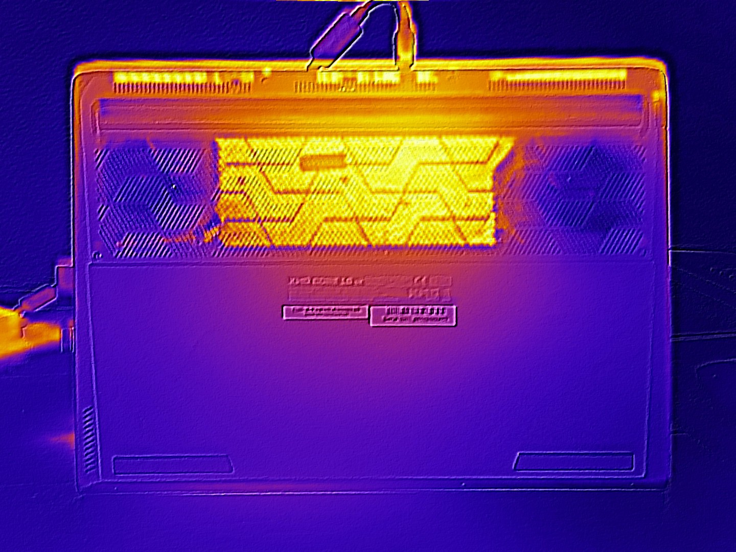 Under load, the underside of the chassis heats up more, reaching a maximum of 57 °C, while the top peaks at 46 °C. In idle scenarios, the chassis settles at a moderate 25 to 31 °C.