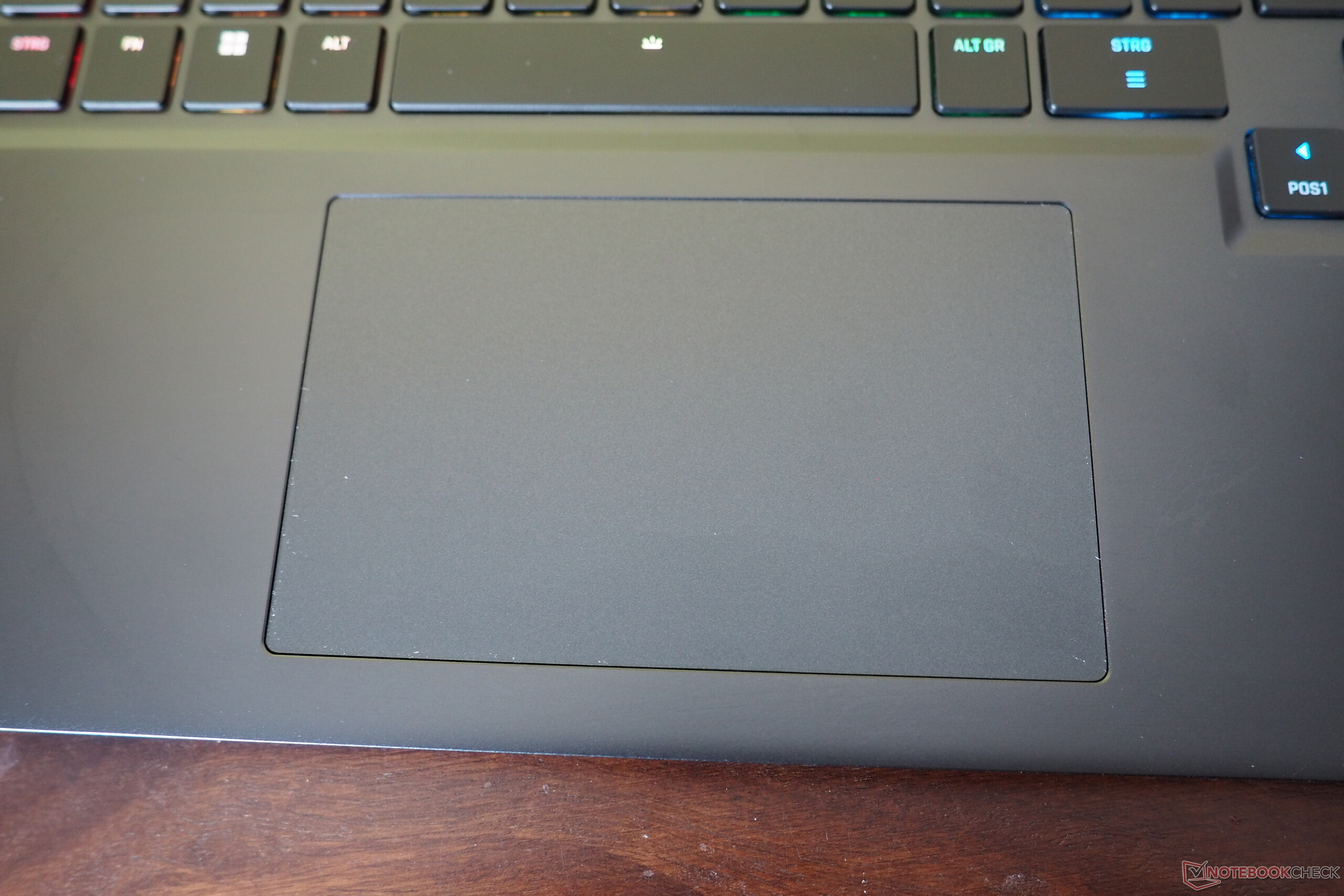 The touchpad measures roughly 12.3 × 7.6 cm, which is appropriate for a laptop of this size. One minor drawback: the click zones are quite loud and feel a bit rattly.