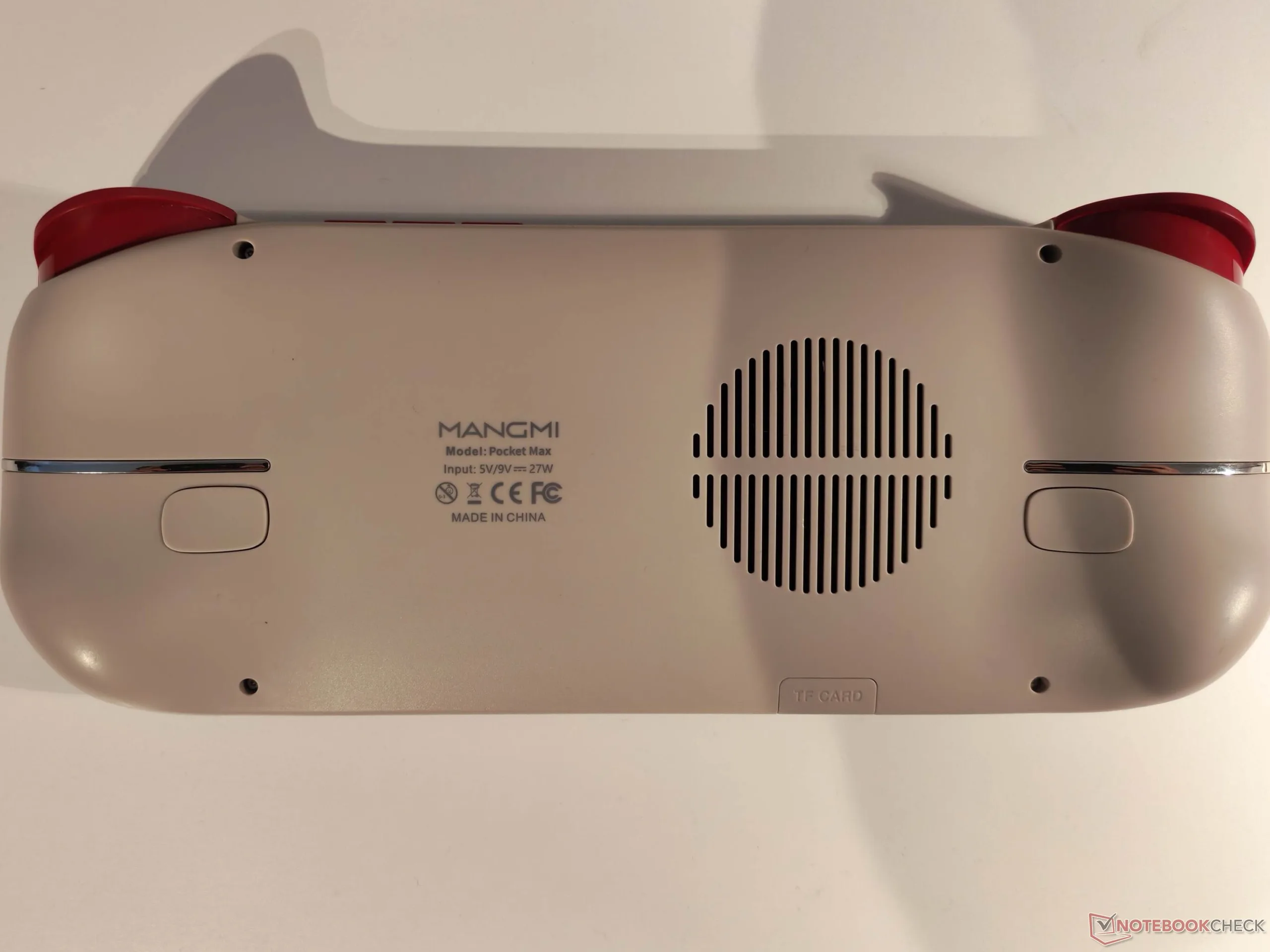 The Mangmi Pocket Max comes with a seven-inch display and is therefore definitely no longer a very compact (retro) handheld. The entire front is at one height and has a glass panel. The back is ergonomically shaped, so there are molded horns on the left and right - which also house the vibration motors. A ventilation grille can also be seen, and there is another grille on the top.