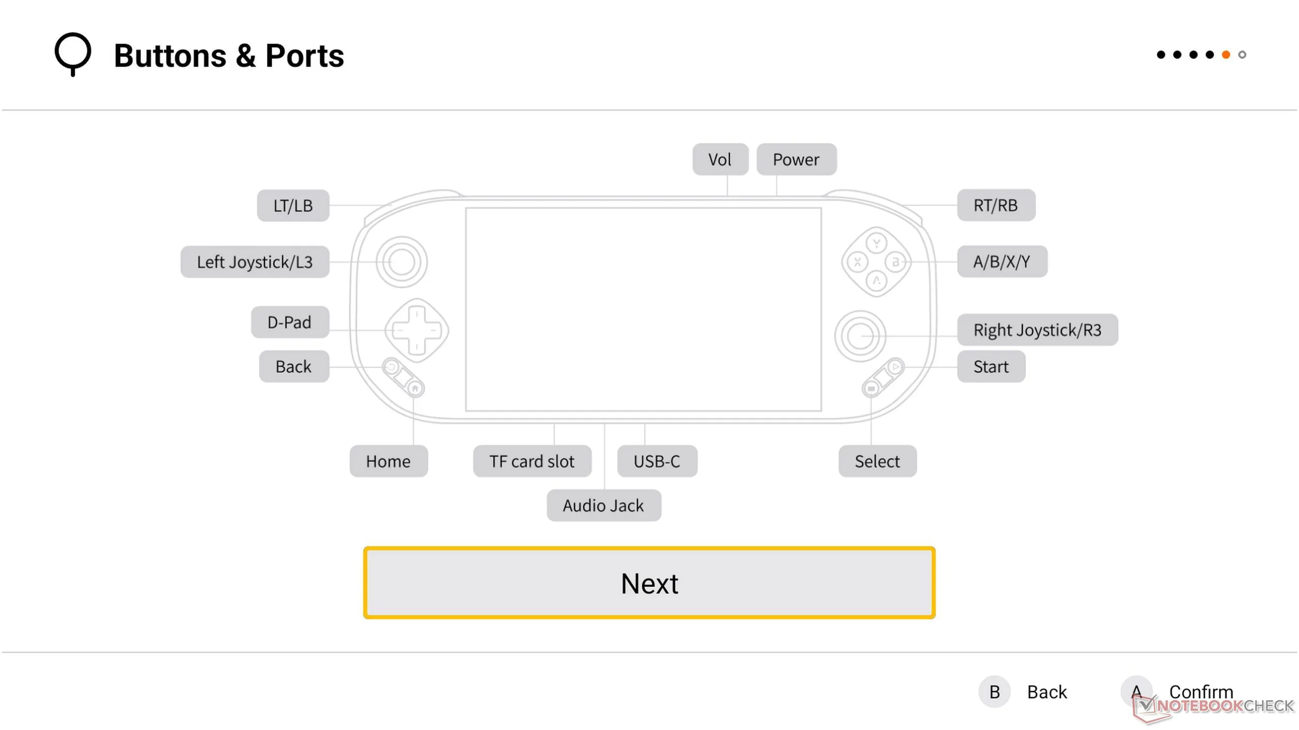 On the back are the two additional buttons, which can be operated easily with the middle finger. The USB Type C port, the jack connection and the memory card slot are located on the underside, next to the microphone. On the top, there are three buttons for switching on and controlling the volume, as well as the shoulder buttons and the two triggers. There is little to complain about in terms of the general workmanship; there are no noticeable gaps. The handheld itself is generally stable (torsionally rigid), so slightly increased force will not cause it to creak or even break. The only thing that could be criticized is the grip: This is solely due to the geometry, but the back is smooth.