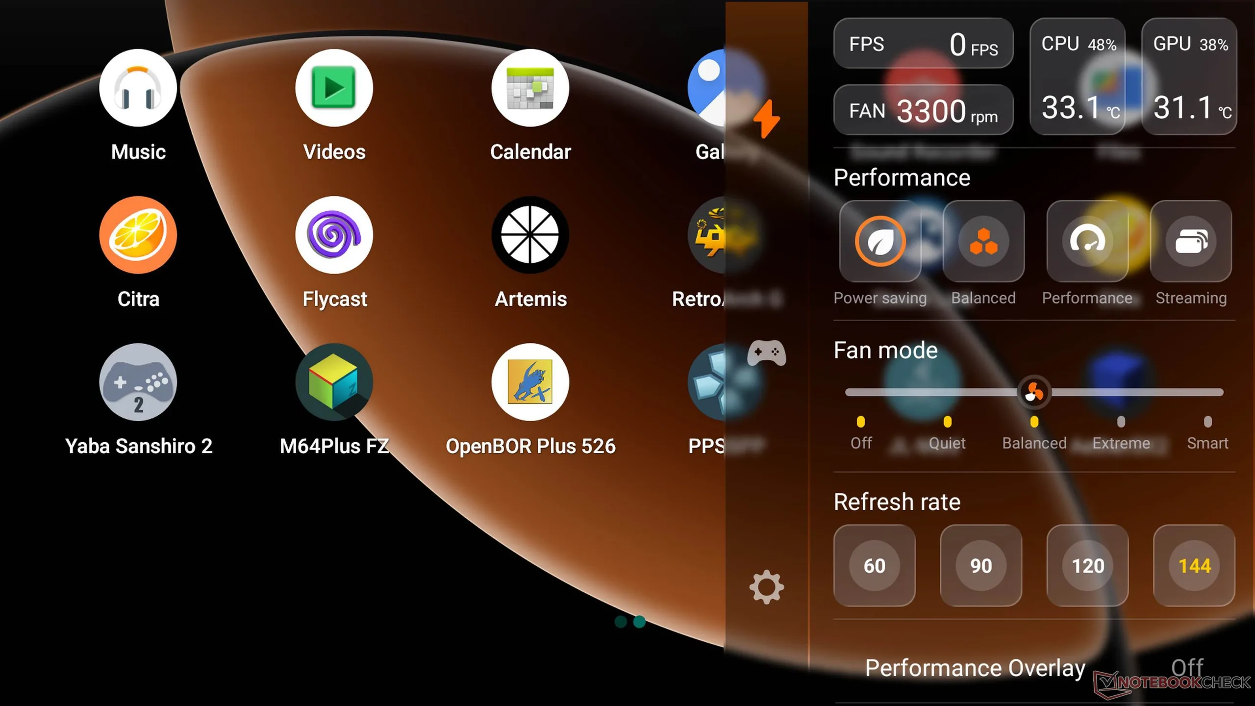 The Mangmi Pocket Max is based on Android 13, so it is easy to set up. Various emulators can be selected during the initial installation and are then immediately available. A very useful quick access bar is integrated with the sidebar, which displays the current load, enables the selection of various performance modes, fan modes and the refresh rate and also provides quick access to operating options.