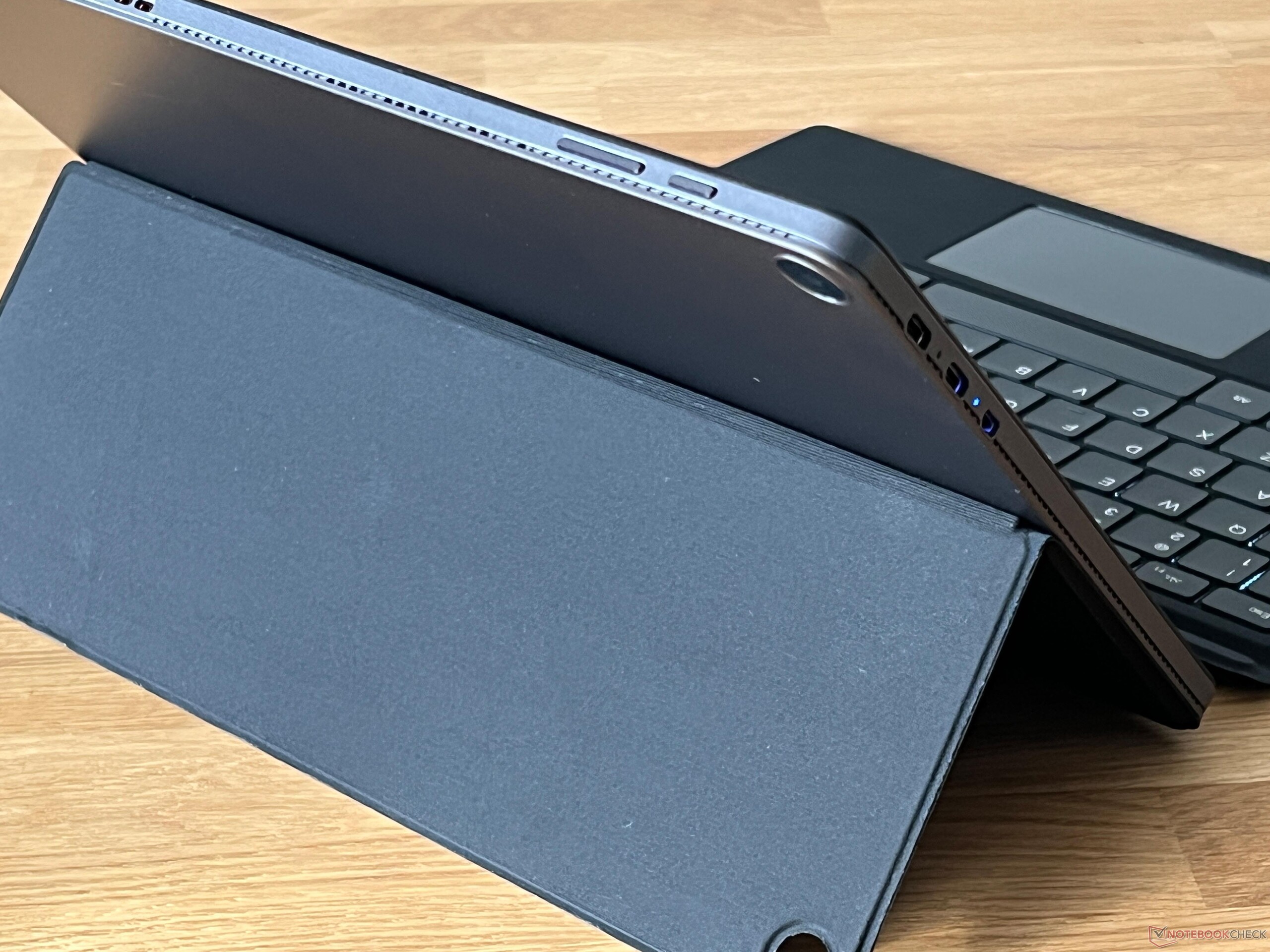 The Hi10 Max is a tablet without a built-in kickstand. Chuwi uses a metal construction, and the dark gray casing feels high-quality, though slight creaking noises are noticeable when the device is twisted. The screen can also be visibly pressed in with a bit of force, but this doesn't negatively affect functionality. Normal touch inputs do not cause this issue. The package includes a back cover with a camera cut-out, the lower half of which attaches magnetically to the casing. The upper part can be folded down to function as a stand, which works well in practice and offers additional protection. The optional keyboard cover is attached to the underside, but the connection is not particularly stable and tends to come loose quickly.